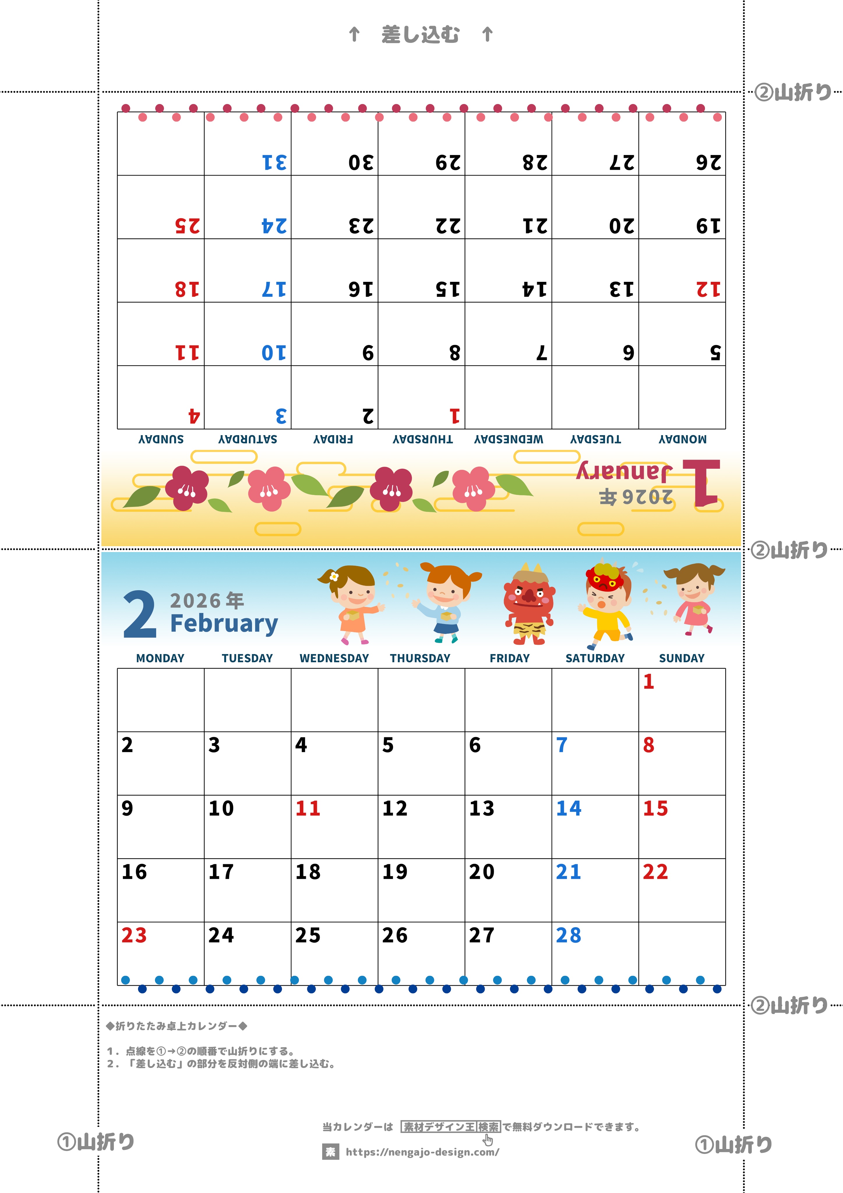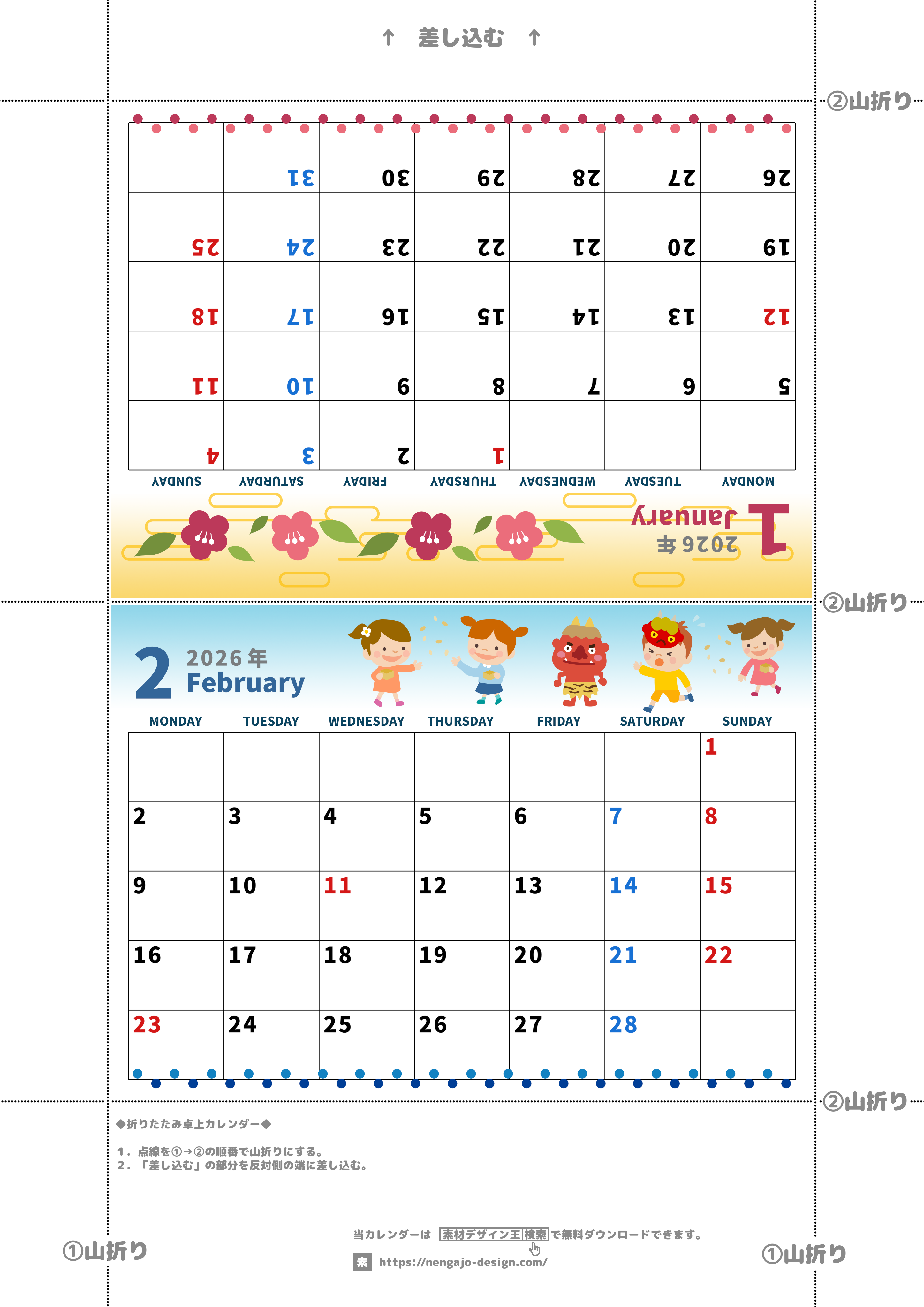 2026年・無料のカレンダーテンプレート 2026年の卓上カレンダー(1月・2月)は月曜始まり♪かわいいイラスト付き♪折り方が分かりやすいガイド付き:無料(2026-000101-0231) 素材状デザイン王 2025年4月14日 2026年の卓上カレンダー(1月・2月)は月曜始まりです。かわいいイラスト付きなのでデスクに彩が生まれます。折り方が分かりやすいガイド付きでありながらもダウンロードは無料で行えます。(2026-000101-0231) かわいい カレンダーデザイン-0001 1月 2月 家族 月曜始まり 卓上