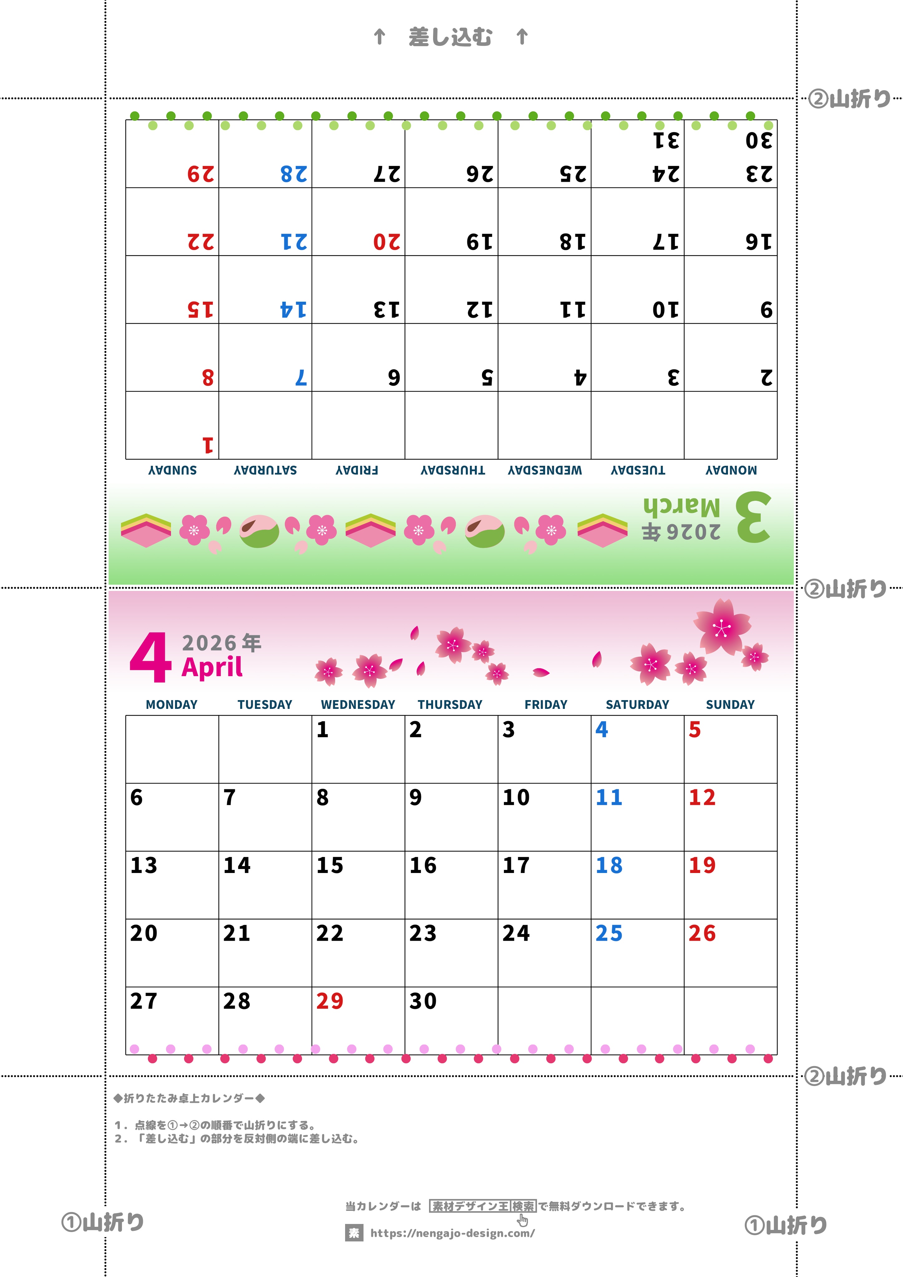 2026年・無料のカレンダーテンプレート 2026年の卓上カレンダー(3月・4月)は月曜始まり♪かわいいイラスト付き♪折り方が分かりやすいガイド付き:無料(2026-000103-0431) 素材状デザイン王 2025年4月14日 2026年の卓上カレンダー(3月・4月)は月曜始まりです。かわいいイラスト付きなのでデスクに彩が生まれます。折り方が分かりやすいガイド付きでありながらもダウンロードは無料で行えます。(2026-000103-0431) かわいい カレンダーデザイン-0001 3月 4月 家族 月曜始まり 卓上