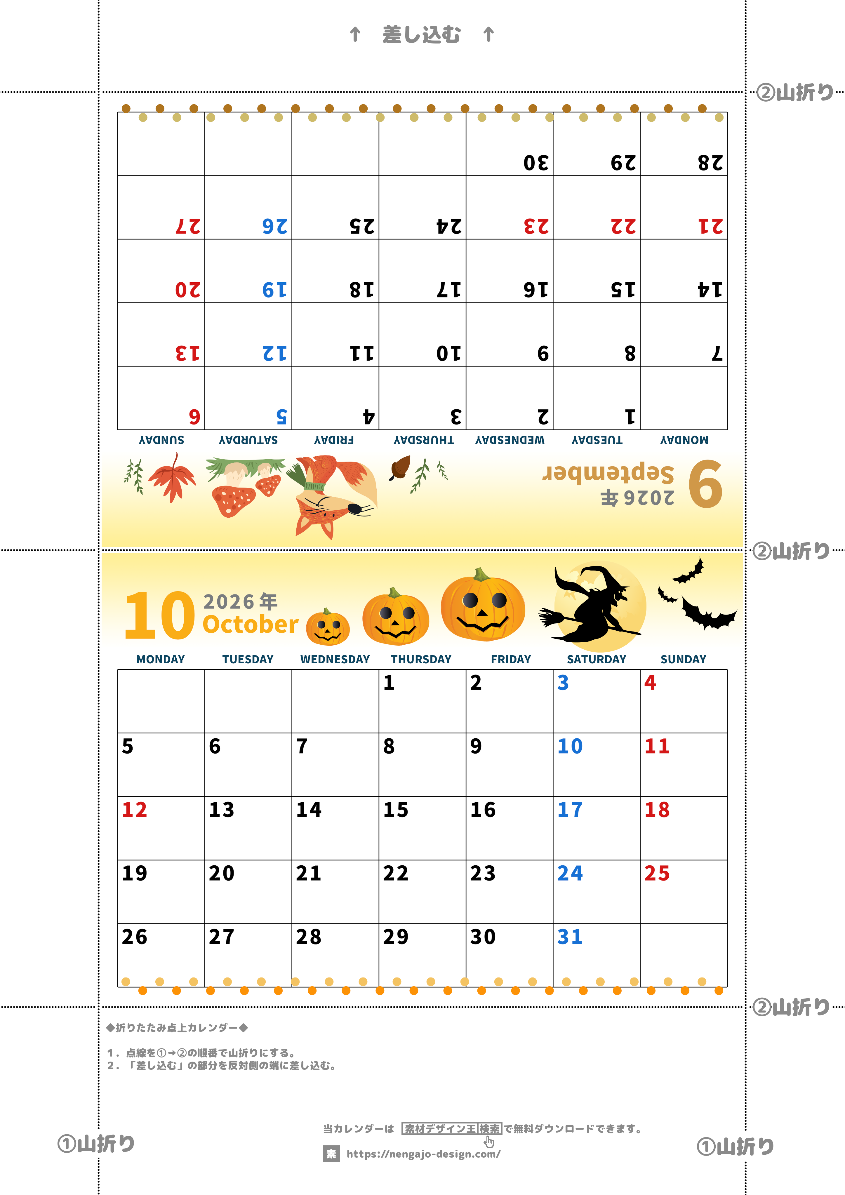 2026年・無料のカレンダーテンプレート 2026年の卓上カレンダー(9月・10月)は月曜始まり♪かわいいイラスト付き♪折り方が分かりやすいガイド付き:無料(2026-000109-1031) 素材状デザイン王 2025年4月14日 2026年の卓上カレンダー(9月・10月)は月曜始まりです。かわいいイラスト付きなのでデスクに彩が生まれます。折り方が分かりやすいガイド付きでありながらもダウンロードは無料で行えます。(2026-000109-1031) かわいい カレンダーデザイン-0001 9月 10月 家族 月曜始まり 卓上