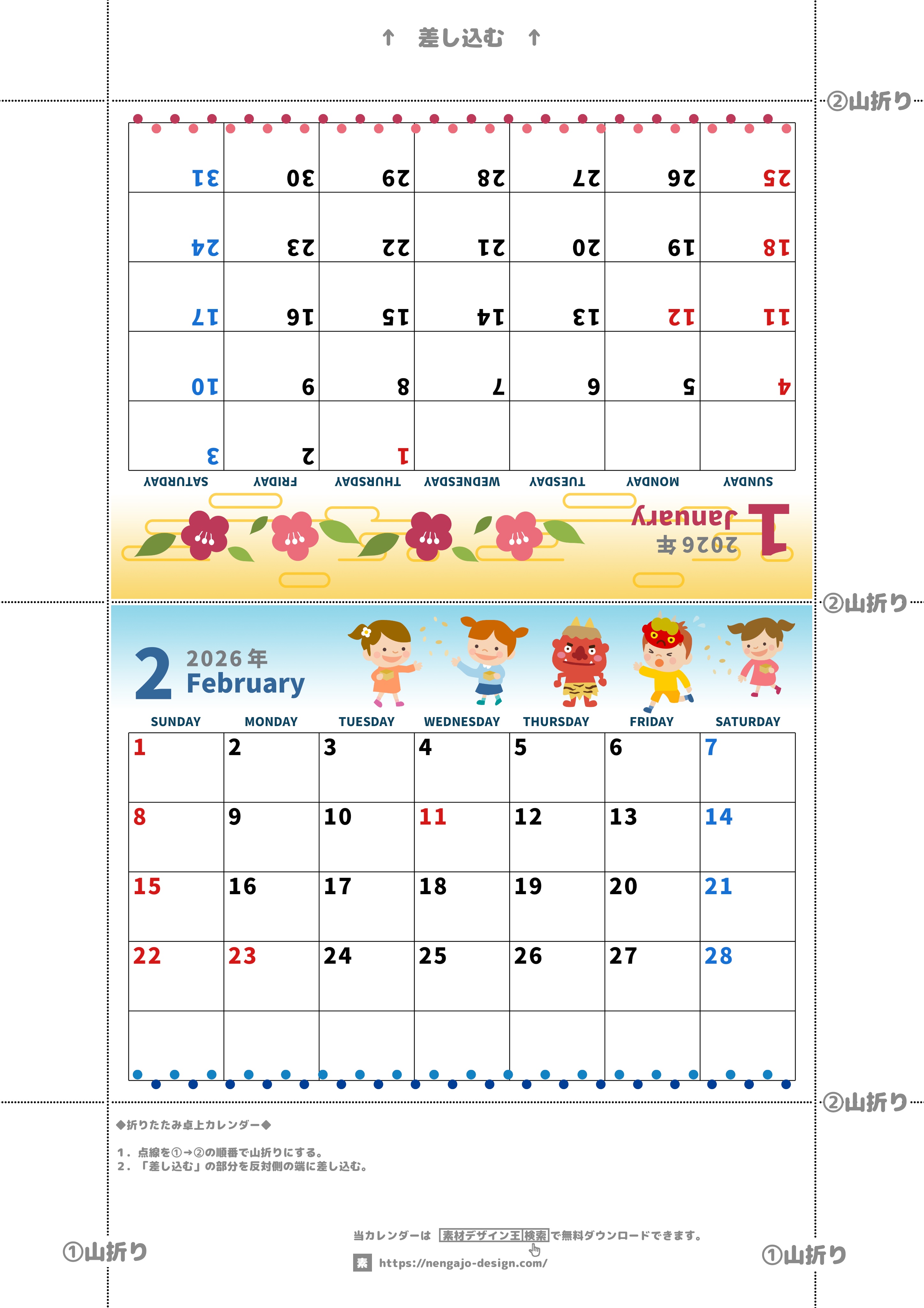 2026年・無料のカレンダーテンプレート 2026年の卓上カレンダー(1月・2月)は日曜始まり♪かわいいイラスト付き♪折り方が分かりやすいガイド付き:無料(2026-000101-0230) 素材状デザイン王 2025年4月14日 2026年の卓上カレンダー(1月・2月)は日曜始まりです。かわいいイラスト付きなのでデスクに彩が生まれます。折り方が分かりやすいガイド付きでありながらもダウンロードは無料で行えます。(2026-000101-0230) かわいい カレンダーデザイン-0001 1月 2月 家族 日曜始まり 卓上