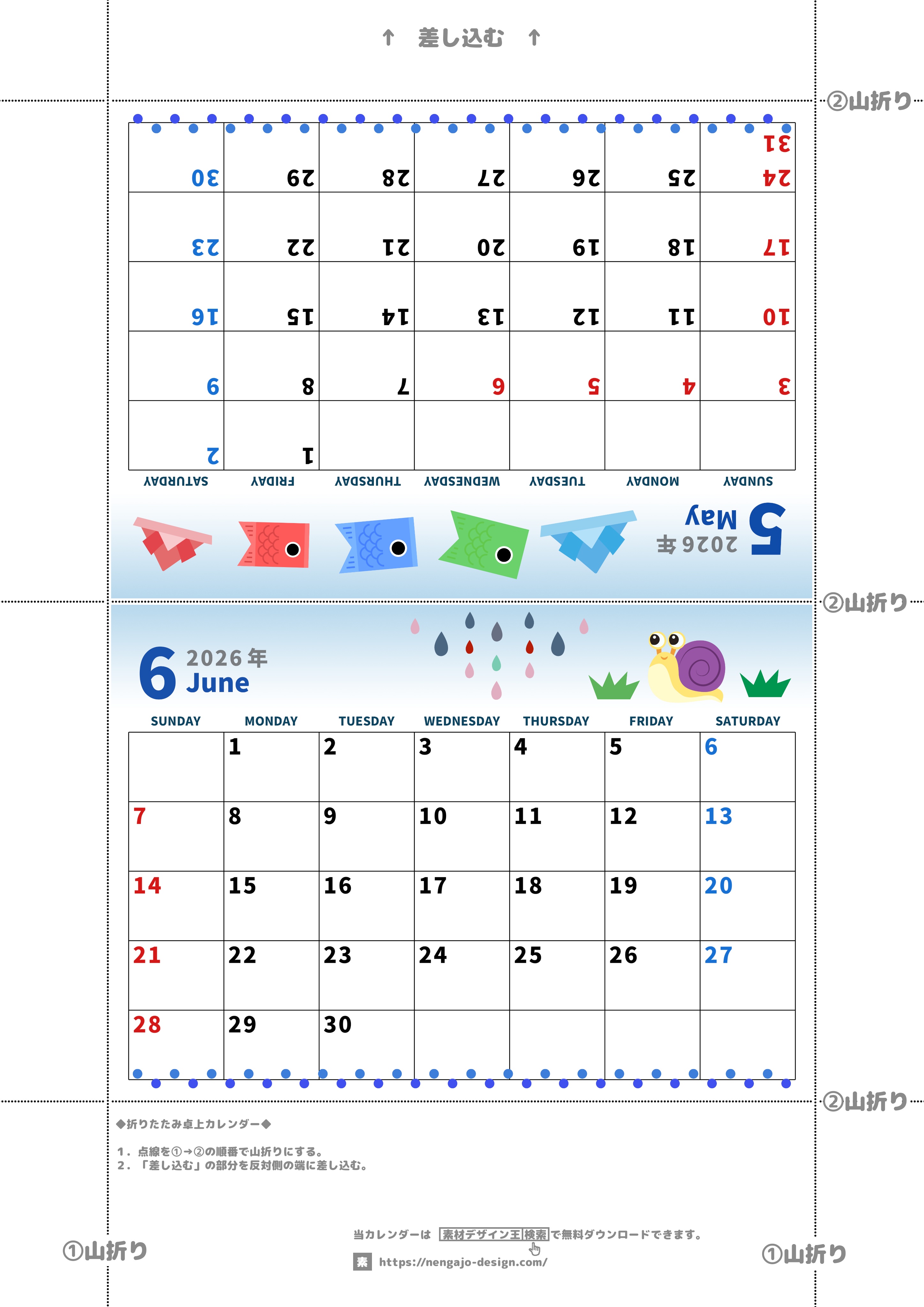 2026年・無料のカレンダーテンプレート 2026年の卓上カレンダー(5月・6月)は日曜始まり♪かわいいイラスト付き♪折り方が分かりやすいガイド付き:無料(2026-000105-0630) 素材状デザイン王 2025年4月14日 2026年の卓上カレンダー(5月・6月)は日曜始まりです。かわいいイラスト付きなのでデスクに彩が生まれます。折り方が分かりやすいガイド付きでありながらもダウンロードは無料で行えます。(2026-000105-0630) かわいい カレンダーデザイン-0001 5月 6月 家族 日曜始まり 卓上