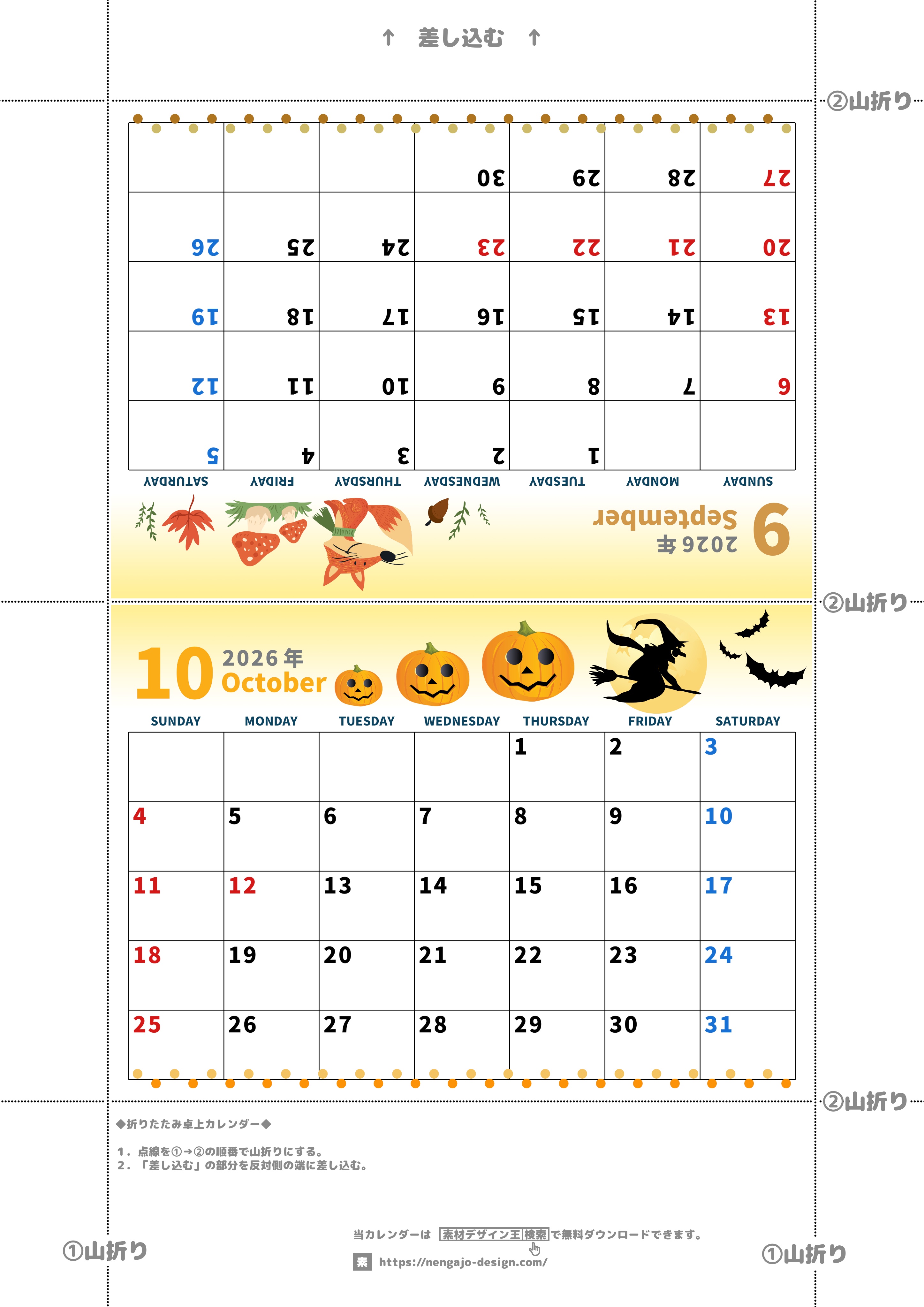 2026年・無料のカレンダーテンプレート 2026年の卓上カレンダー(9月・10月)は日曜始まり♪かわいいイラスト付き♪折り方が分かりやすいガイド付き:無料(2026-000109-1030) 素材状デザイン王 2025年4月14日 2026年の卓上カレンダー(9月・10月)は日曜始まりです。かわいいイラスト付きなのでデスクに彩が生まれます。折り方が分かりやすいガイド付きでありながらもダウンロードは無料で行えます。(2026-000109-1030) かわいい カレンダーデザイン-0001 9月 10月 家族 日曜始まり 卓上