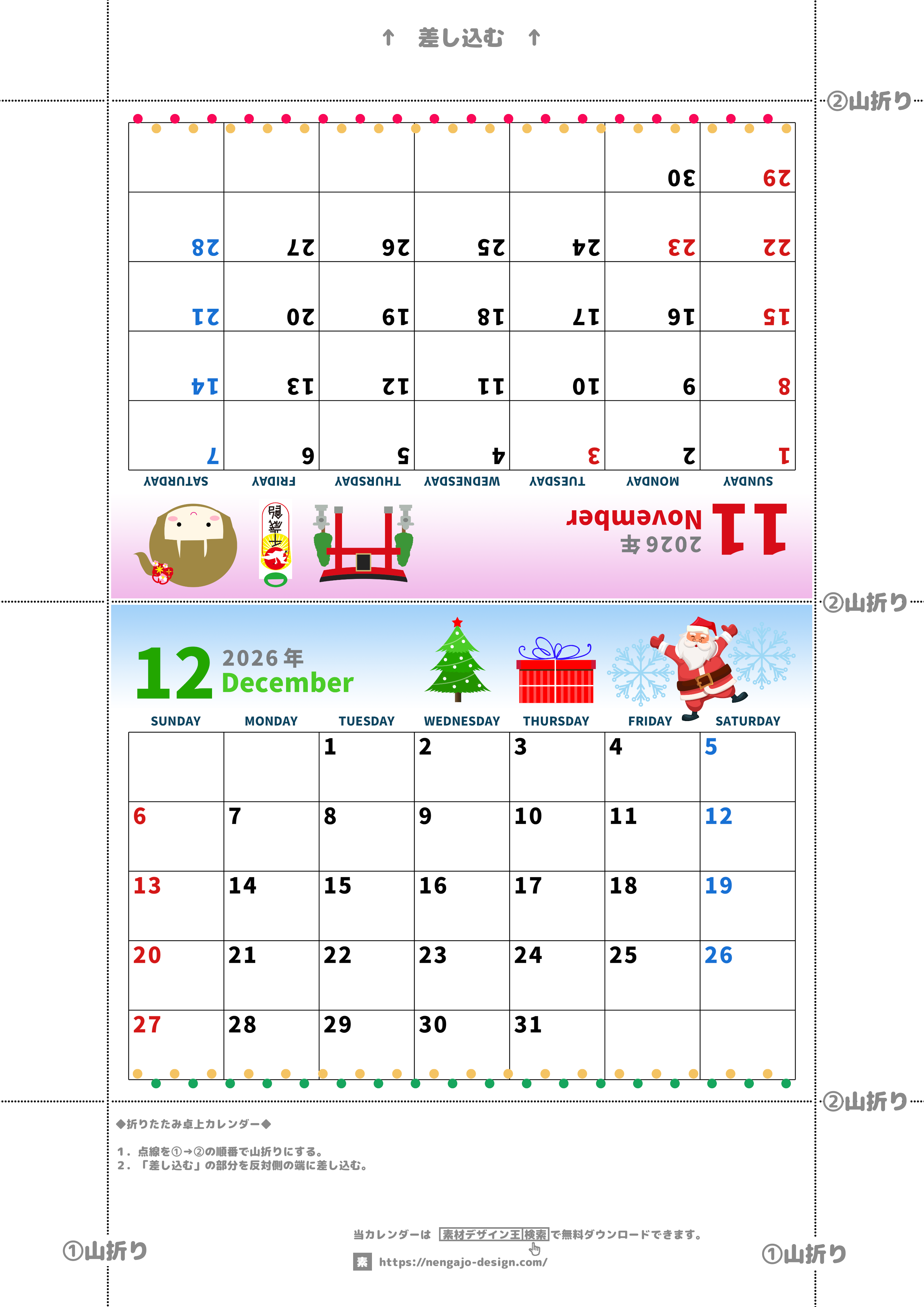 2026年・無料のカレンダーテンプレート 2026年の卓上カレンダー(11月・12月)は日曜始まり♪かわいいイラスト付き♪折り方が分かりやすいガイド付き:無料(2026-000111-1230) 素材状デザイン王 2025年4月14日 2026年の卓上カレンダー(11月・12月)は日曜始まりです。かわいいイラスト付きなのでデスクに彩が生まれます。折り方が分かりやすいガイド付きでありながらもダウンロードは無料で行えます。(2026-000111-1230) かわいい カレンダーデザイン-0001 11月 12月 家族 日曜始まり 卓上