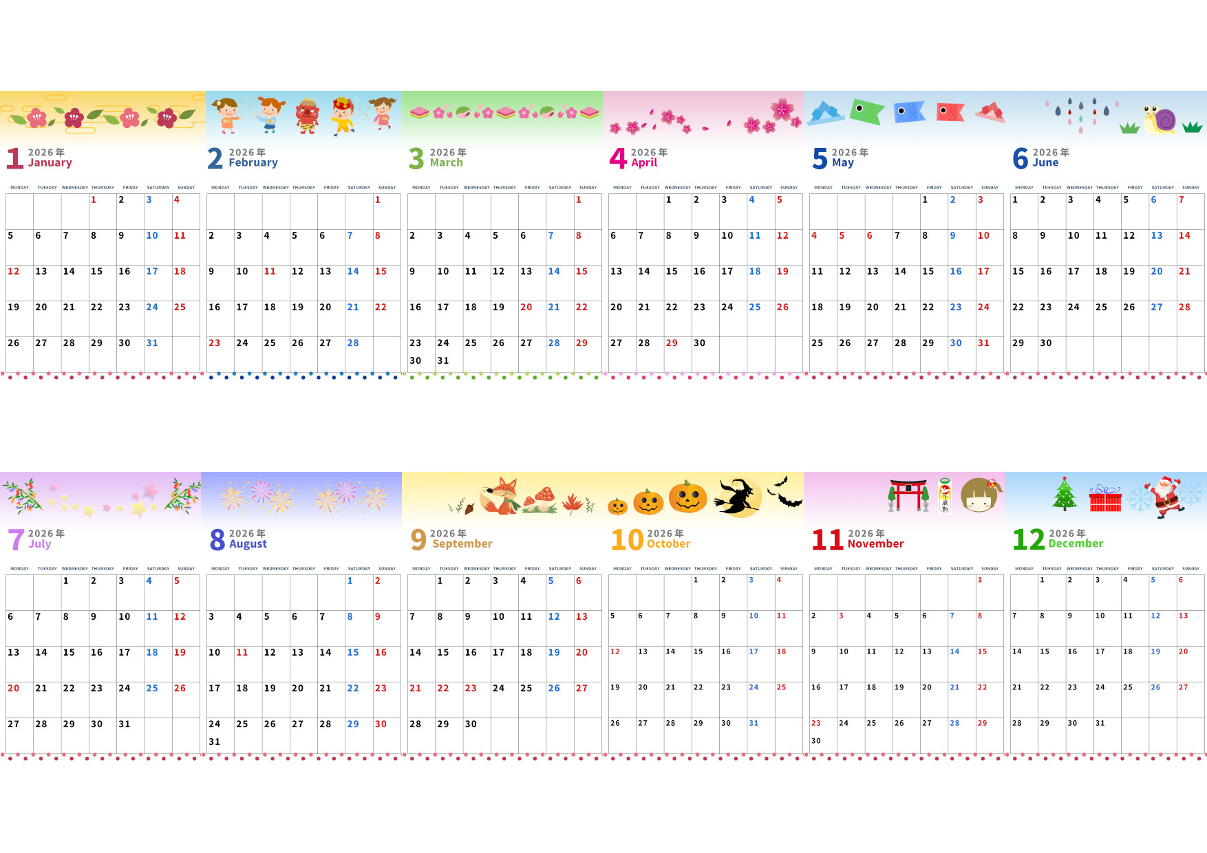2026年版年間カレンダー♪A4縦型の月曜始まりでかわいい季節イラストがずらり!無料でダウンロードできます!