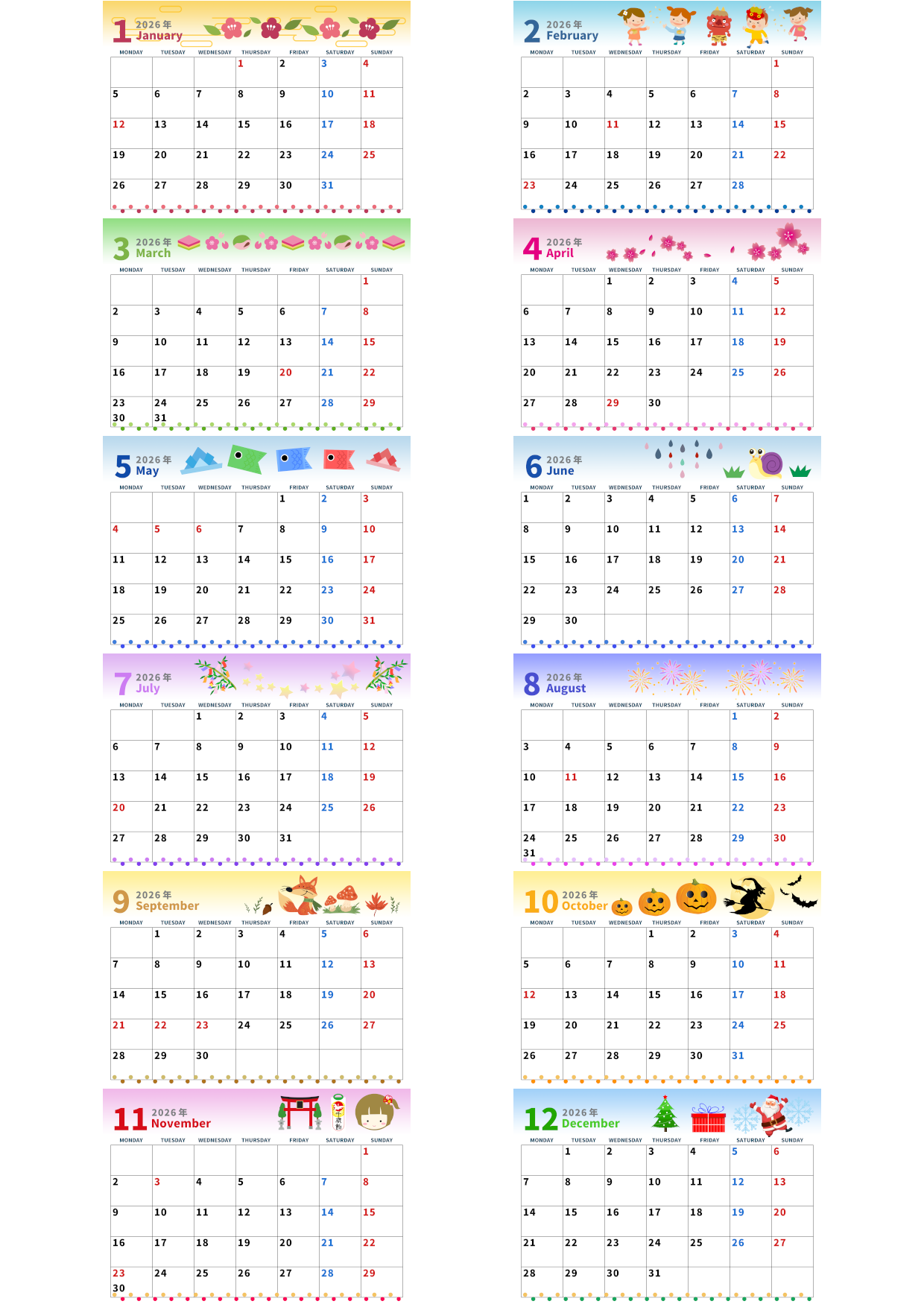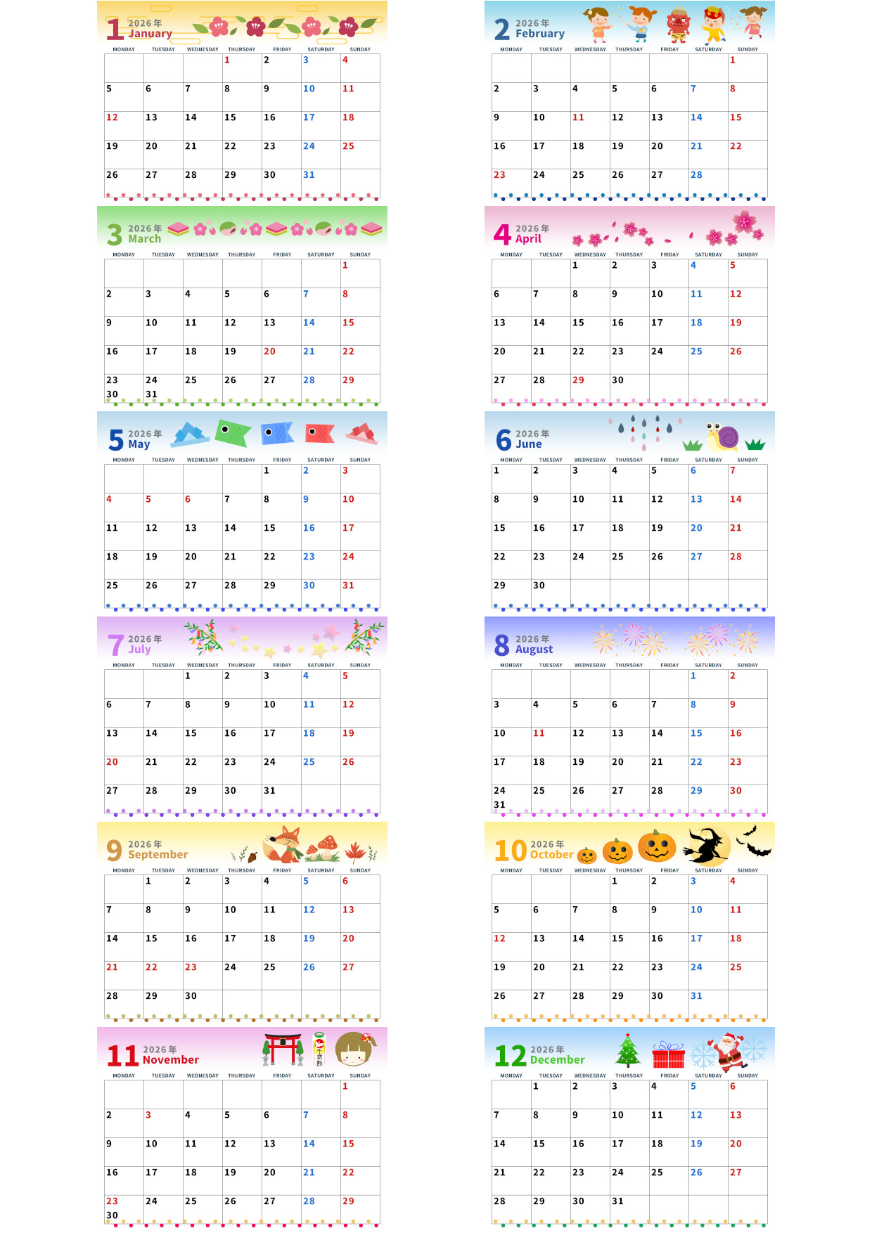 2026年の年間カレンダーを無料ダウンロードできます。A4横型の月曜始まりなので、学校や会社のスケジュールと合わせて使いやすい形式です。かわいいポップな季節行事イララストが各月に配置されていて、見るたびに気分が明るくなります。1枚で12ヶ月分を一覧できるため、長期のプロジェクト管理や年間の学習計画にもぴったりです。カラフルながらも文字が読みやすいように配慮されたデザインで、実用性とかわいさを両立させたカレンダーになっています。