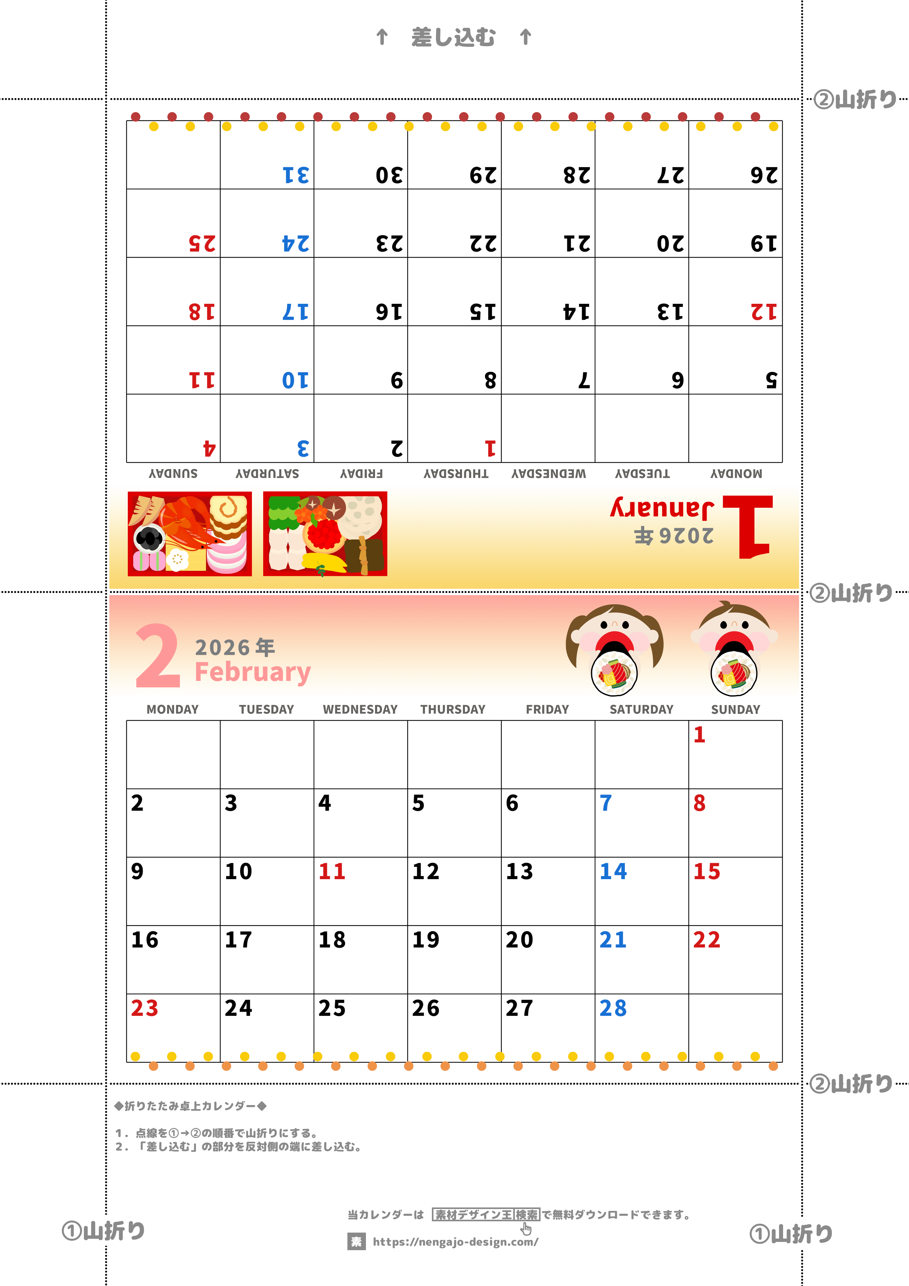 2026年・無料のカレンダーテンプレート 2026年の卓上カレンダー(1月・2月)は月曜始まり♪かわいいだけでなく折り方ガイド付きで作り方が簡単♪無料/A4(2026-000201-0231) 素材状デザイン王 2025年4月14日 2026年の卓上カレンダー(1月・2月)は月曜始まり♪かわいいだけでなく折り方ガイド付きで作り方が簡単♪無料/A4(2026-000201-0231) かわいい カレンダーデザイン-0002 1月 2月 家族 月曜始まり 卓上