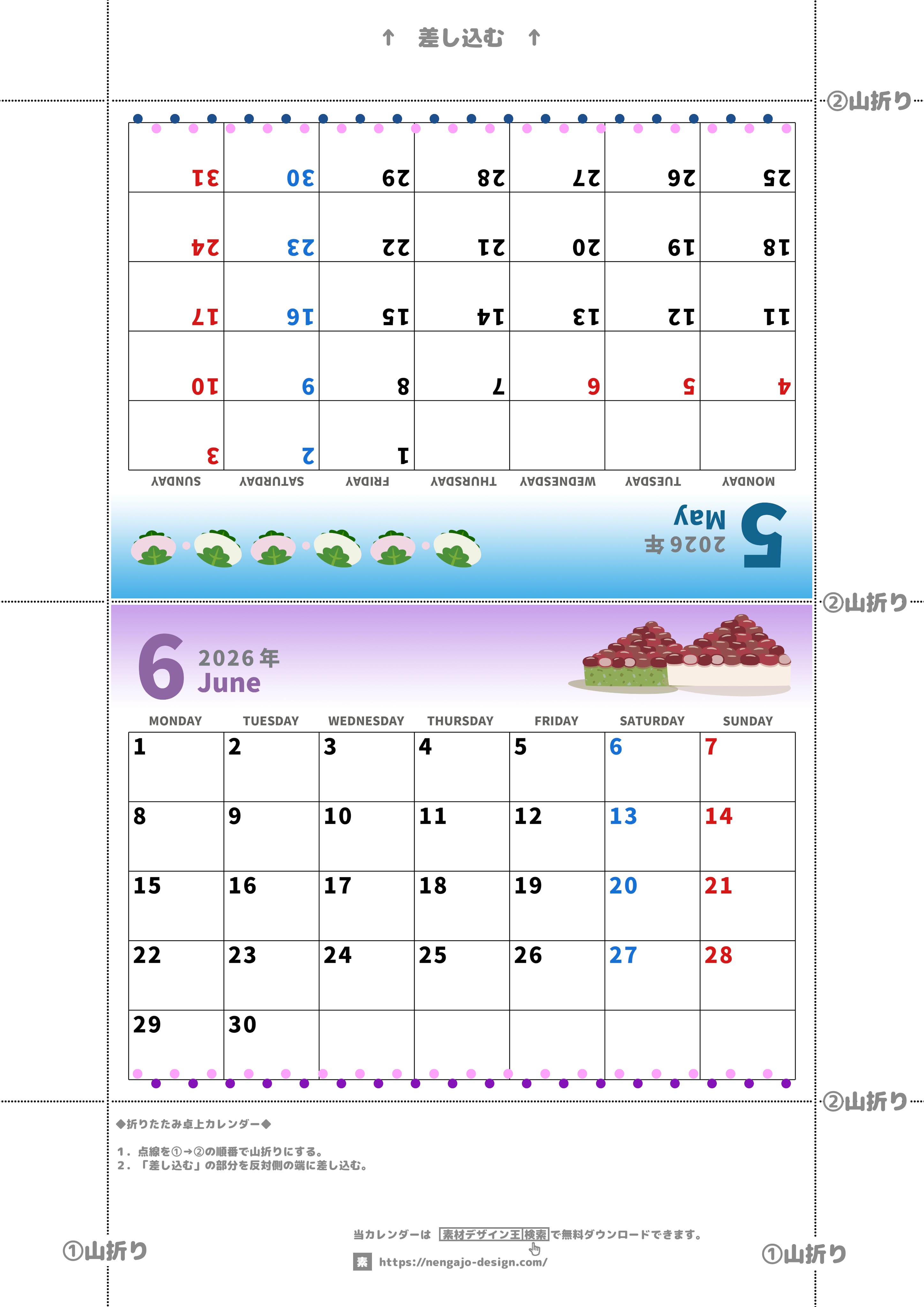2026年・無料のカレンダーテンプレート 2026年の卓上カレンダー(5月・6月)は月曜始まり♪かわいいだけでなく折り方ガイド付きで作り方が簡単♪無料/A4(2026-000205-0631) 素材状デザイン王 2025年4月14日 2026年の卓上カレンダー(5月・6月)は月曜始まり♪かわいいだけでなく折り方ガイド付きで作り方が簡単♪無料/A4(2026-000205-0631) かわいい カレンダーデザイン-0002 5月 6月 家族 月曜始まり 卓上