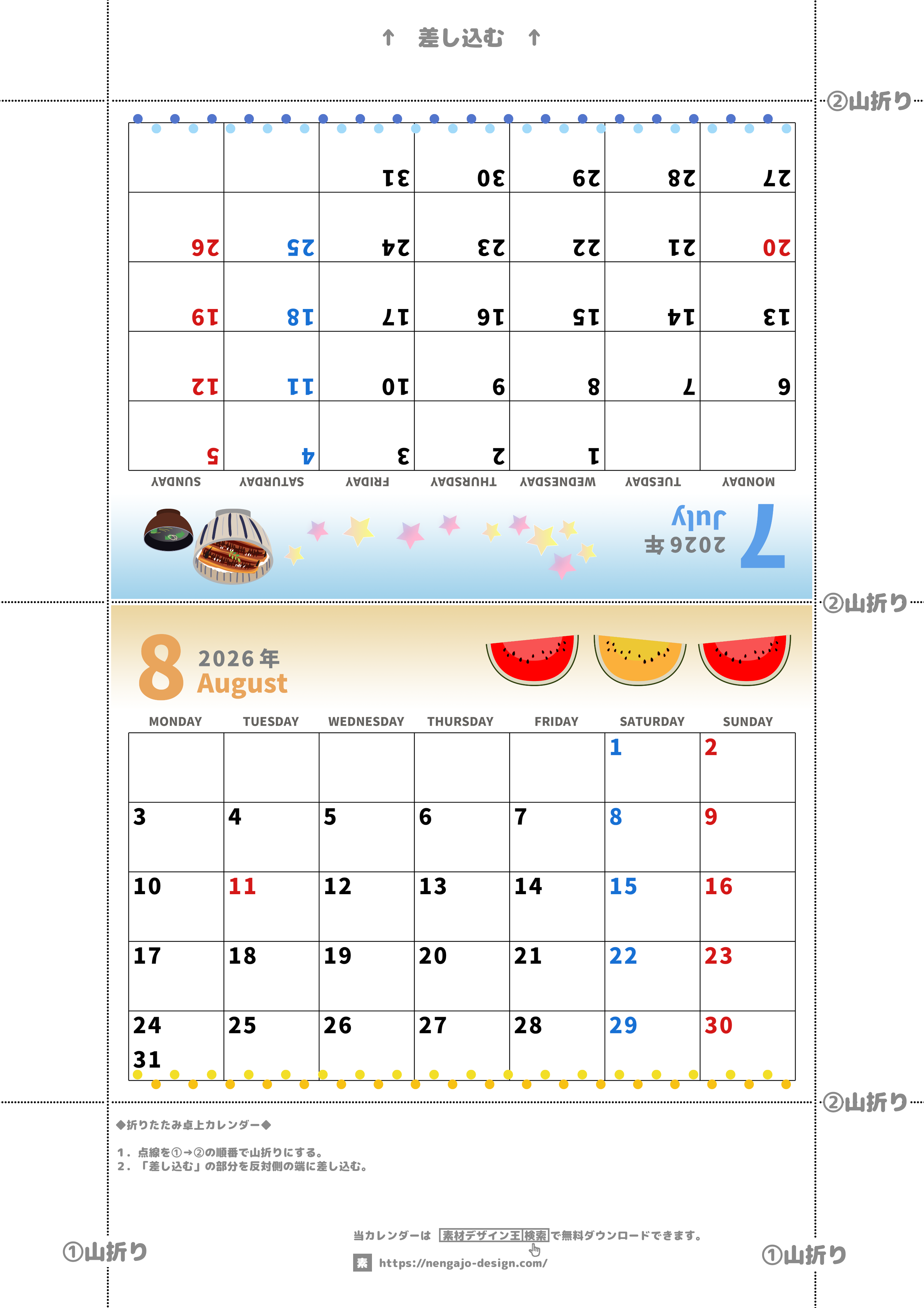 2026年・無料のカレンダーテンプレート 2026年の卓上カレンダー(7月・8月)は月曜始まり♪かわいいだけでなく折り方ガイド付きで作り方が簡単♪無料/A4(2026-000207-0831) 素材状デザイン王 2025年4月14日 2026年の卓上カレンダー(7月・8月)は月曜始まり♪かわいいだけでなく折り方ガイド付きで作り方が簡単♪無料/A4(2026-000207-0831) かわいい カレンダーデザイン-0002 7月 8月 家族 月曜始まり 卓上
