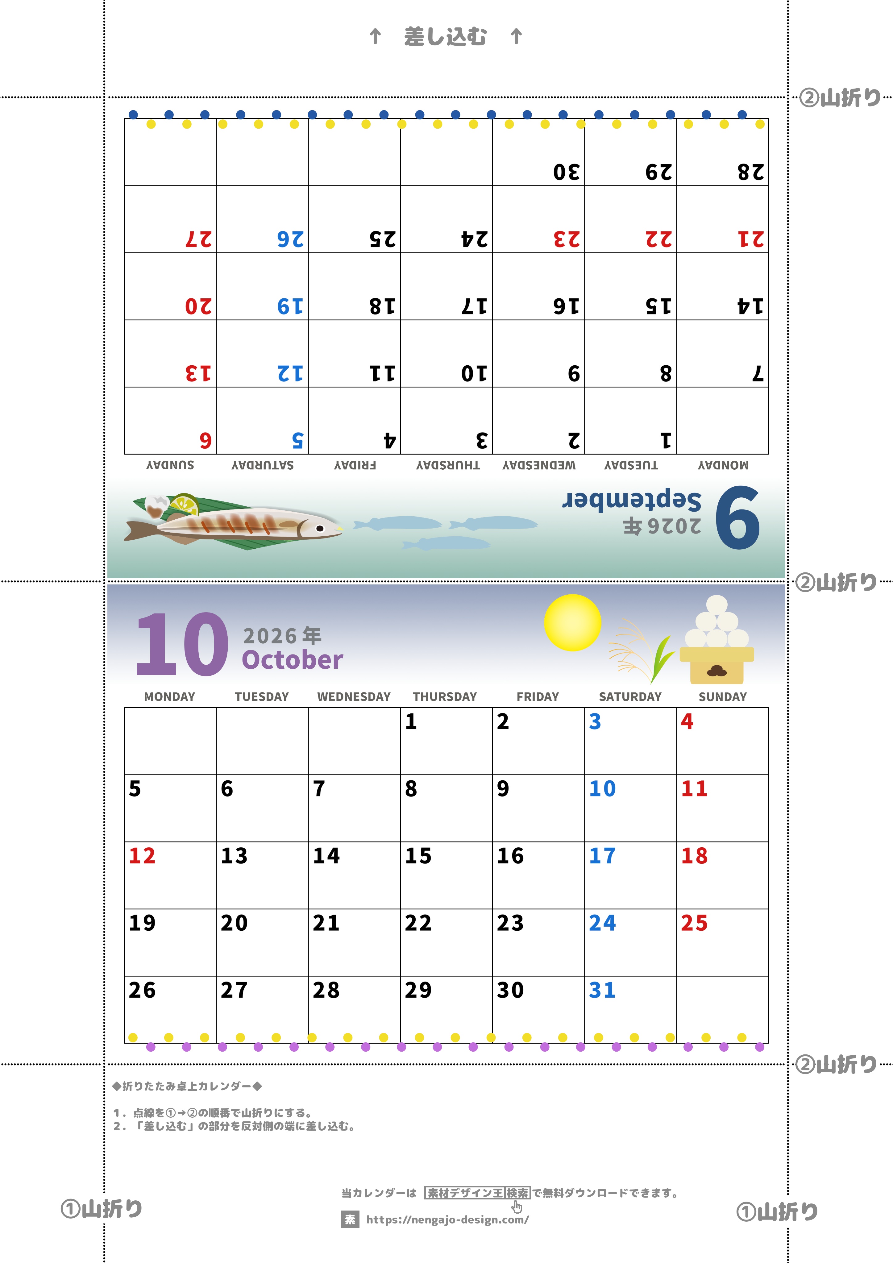 2026年・無料のカレンダーテンプレート 2026年の卓上カレンダー(9月・10月)は月曜始まり♪かわいいだけでなく折り方ガイド付きで作り方が簡単♪無料/A4(2026-000209-1031) 素材状デザイン王 2025年4月14日 2026年の卓上カレンダー(9月・10月)は月曜始まり♪かわいいだけでなく折り方ガイド付きで作り方が簡単♪無料/A4(2026-000209-1031) かわいい カレンダーデザイン-0002 9月 10月 家族 月曜始まり 卓上