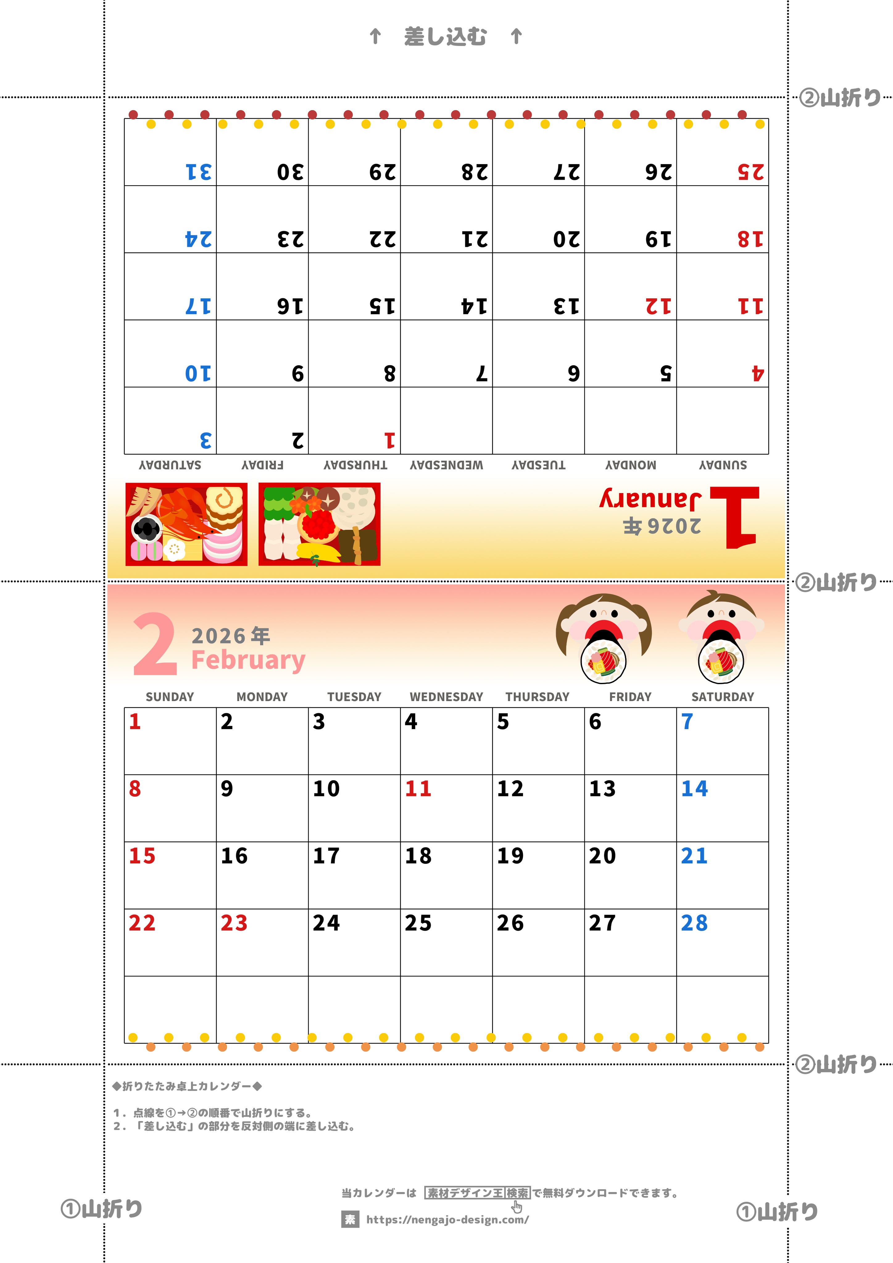 2026年・無料のカレンダーテンプレート 2026年の卓上カレンダー(1月・2月)は日曜始まり♪かわいいだけでなく折り方ガイド付きで作り方が簡単♪無料/A4(2026-000201-0230) 素材状デザイン王 2025年4月14日 2026年の卓上カレンダー(1月・2月)は日曜始まりです。かわいいだけでなく折り方ガイド付きなので作り方が簡単です、ハサミもいらないです。無料ダウンロードしてA4用紙に印刷しましょう。(2026-000201-0230) かわいい カレンダーデザイン-0002 1月 2月 家族 日曜始まり 卓上