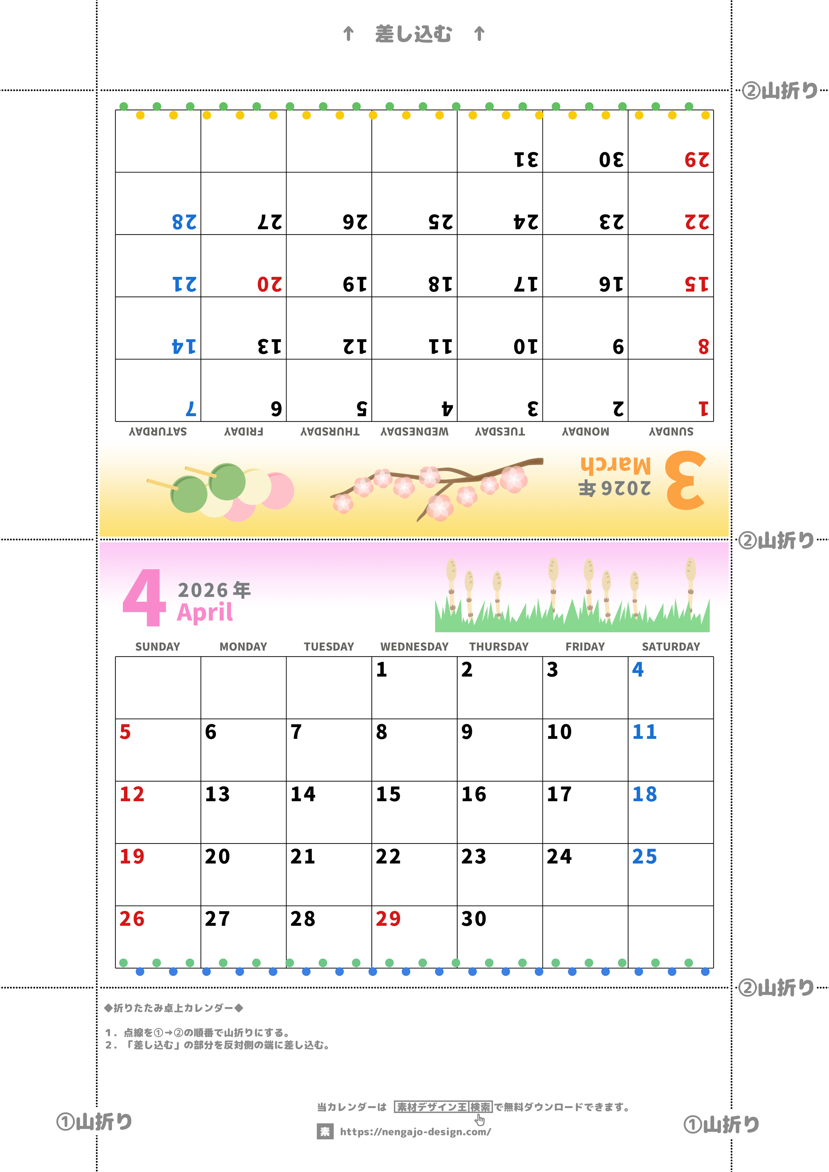 2026年・無料のカレンダーテンプレート 2026年の卓上カレンダー(3月・4月)は日曜始まり♪かわいいだけでなく折り方ガイド付きで作り方が簡単♪無料/A4(2026-000203-0430) 素材状デザイン王 2025年4月14日 2026年の卓上カレンダー(3月・4月)は日曜始まりです。かわいいだけでなく折り方ガイド付きなので作り方が簡単です、ハサミもいらないです。無料ダウンロードしてA4用紙に印刷しましょう。(2026-000203-0430) かわいい カレンダーデザイン-0002 3月 4月 家族 日曜始まり 卓上