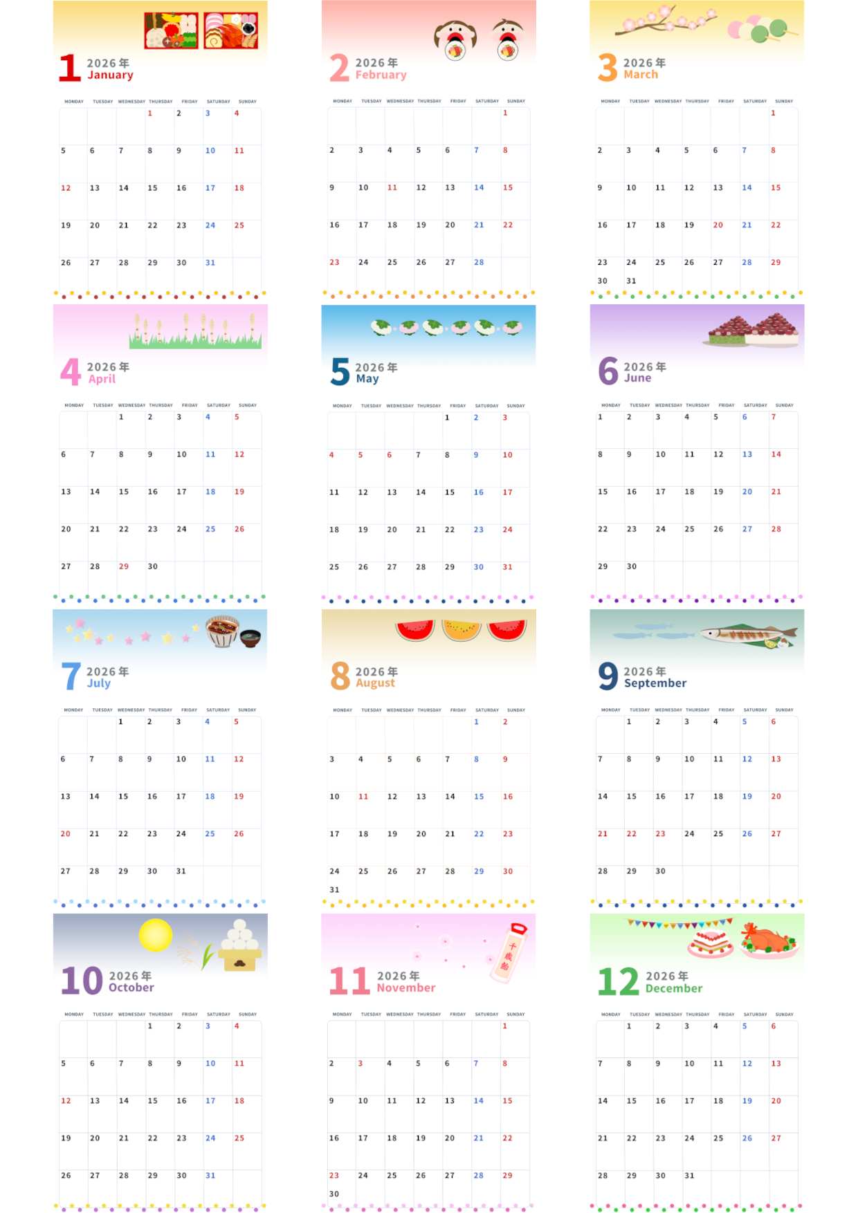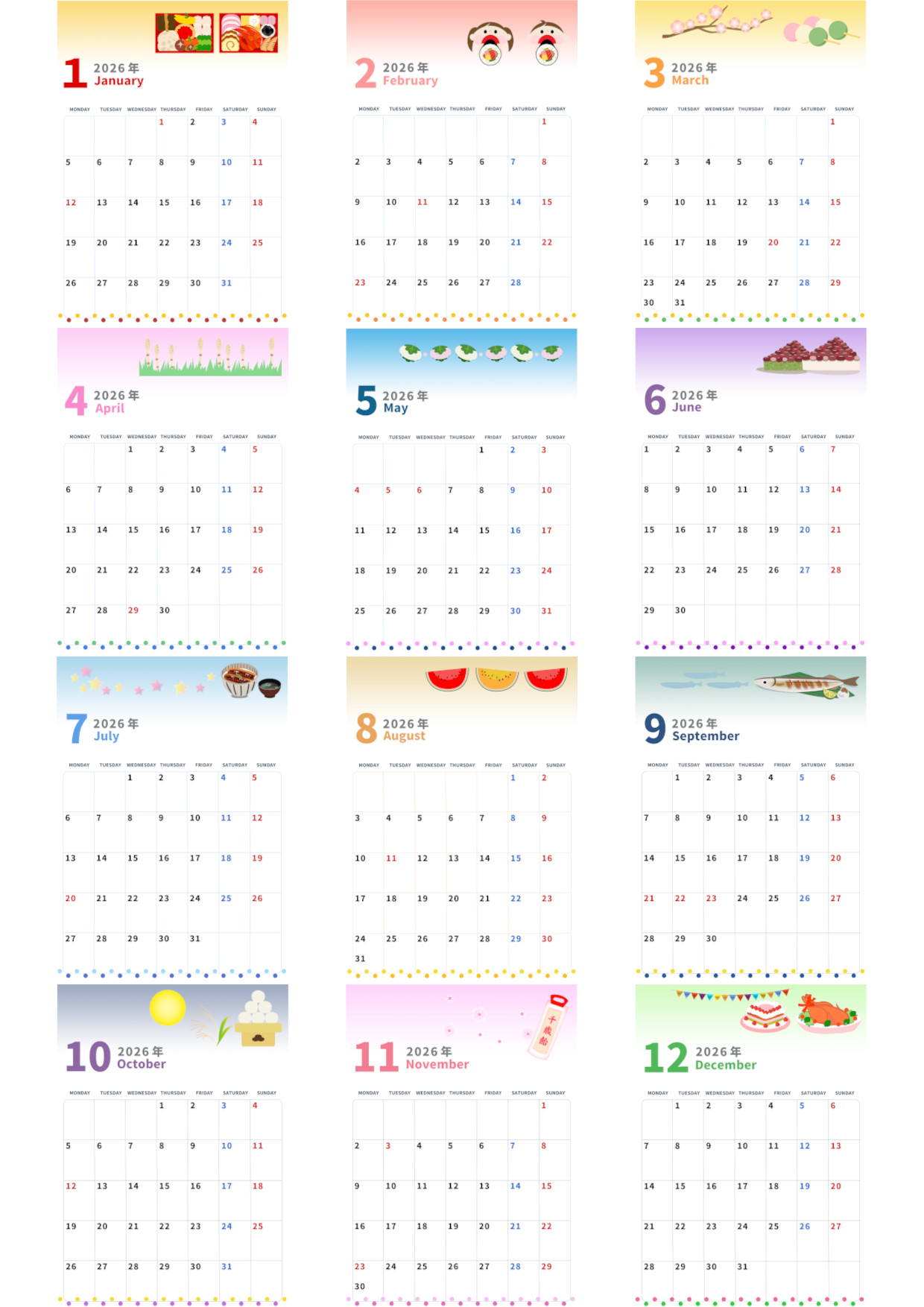年間カレンダー2026を無料ダウンロードできます。A4縦型の月曜始まりで、カラフルで書き込みやすい実用的なデザインが特徴です。各月のマス目には余裕があり、ちょっとしたメモや予定を追加しやすくなっています。シンプルながらも明るい色づかいで、家族全員の予定表や勉強計画、仕事の年間スケジュールなど、さまざまな用途に対応します。1年を通してしっかり活用できるフリー素材のカレンダーです。