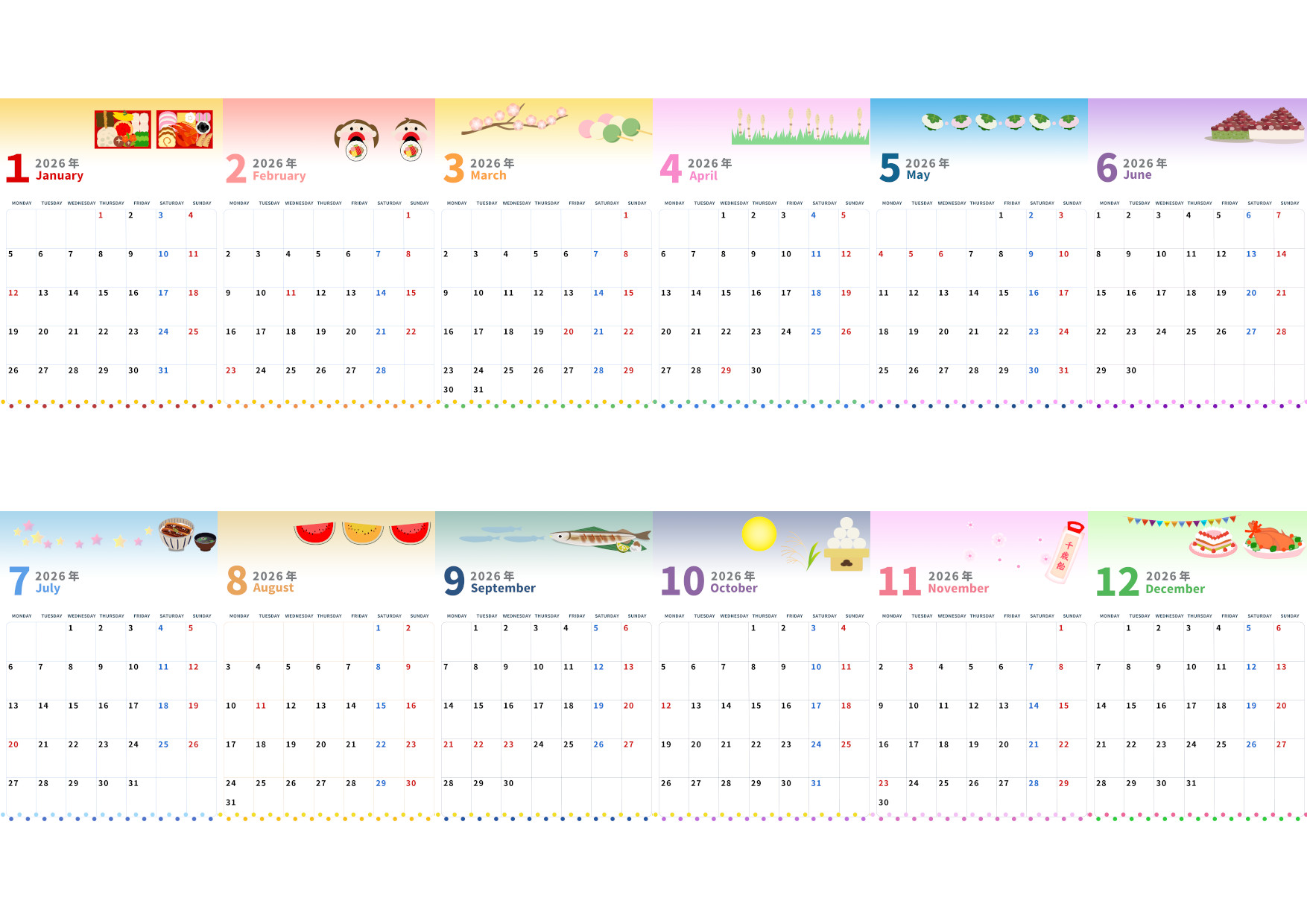 2026年版年間カレンダー♪A4縦型の月曜始まりで見やすさ重視のシンプルカラー!無料でダウンロードできます!