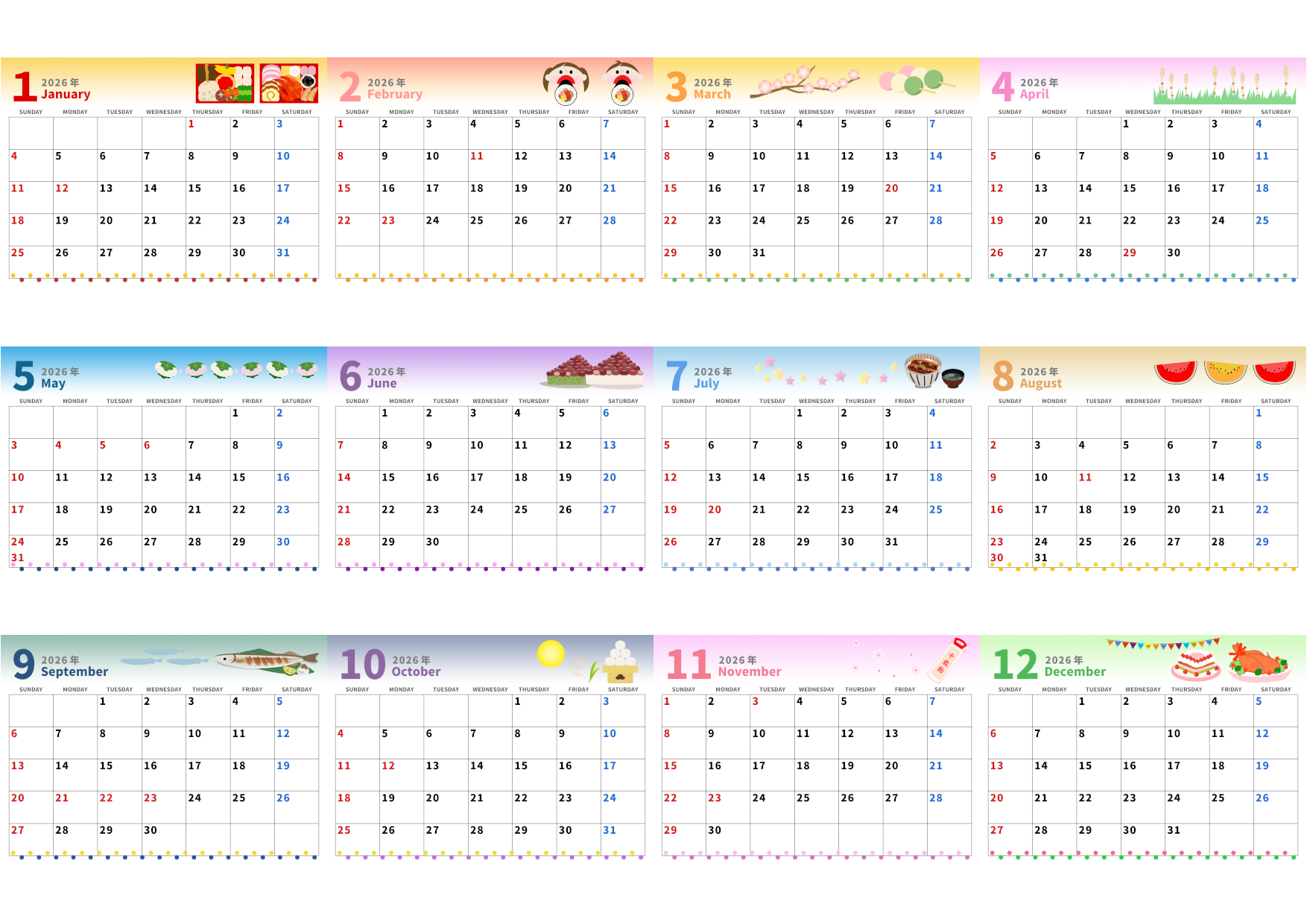 A4一枚で使える2026年の年間カレンダーを無料でダウンロードできます。横向きの日曜始まりで、曜日ごとに色分けされた見やすいレイアウトが特徴です。12ヶ月分を一度に俯瞰できるため、旅行の計画や受験スケジュール、仕事の繁忙期管理などにも便利です。カラフルですが、目が疲れにくい色合いで整えているので、長期間貼っておいても使いやすいデザインです。シンプルかつ実用性重視の年間カレンダーを探している方におすすめです。