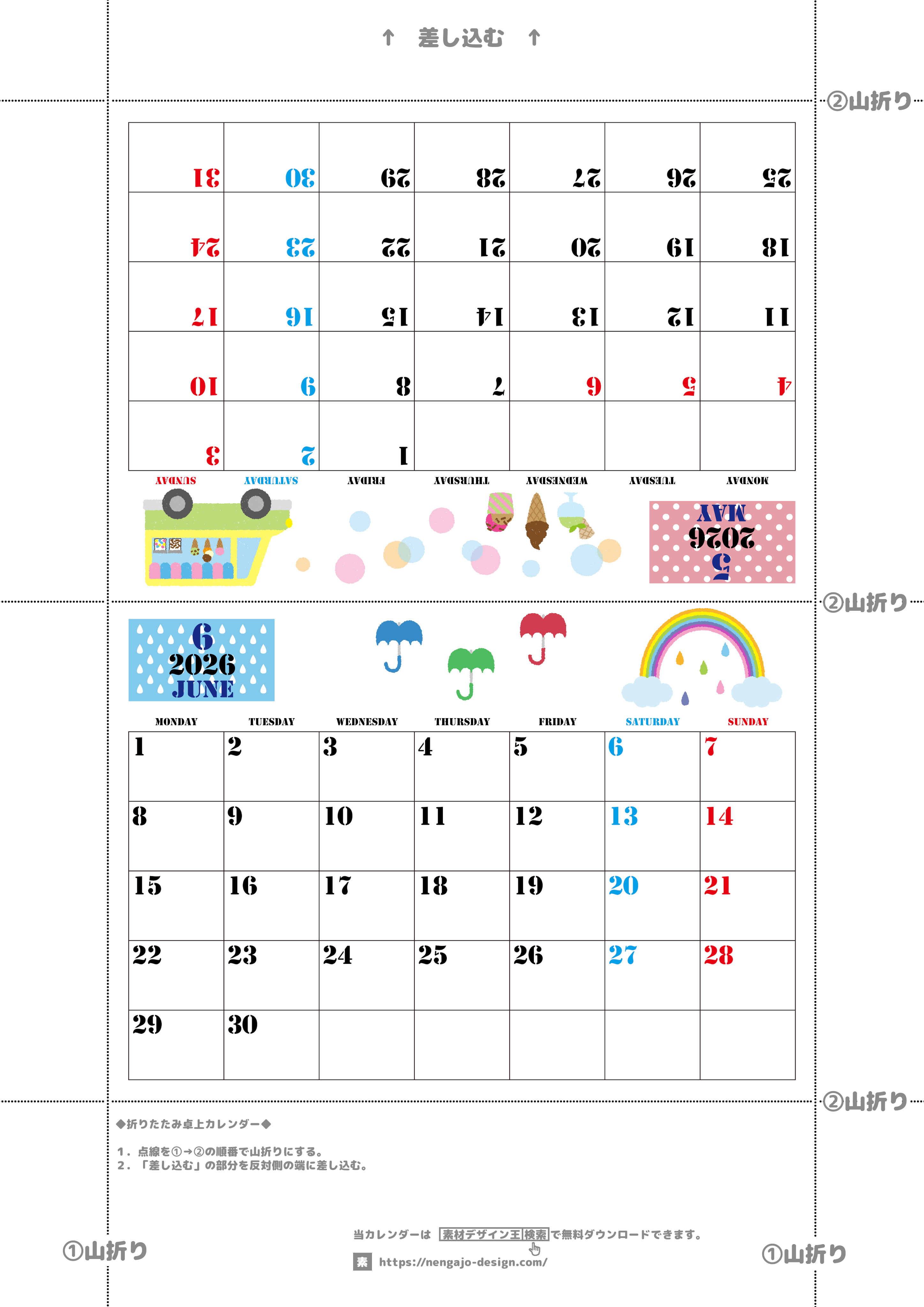 2026年・無料のカレンダーテンプレート 2026年の卓上カレンダー(5月・6月)は月曜始まり♪おしゃれなイラスト付き♪折り方が分かりやすいガイド付:無料(2026-000305-0631) 素材状デザイン王 2025年4月14日 2026年の卓上カレンダー(5月・6月)は月曜始まり♪おしゃれなイラスト付き♪折り方が分かりやすいガイド付:無料(2026-000305-0631) おしゃれ カレンダーデザイン-0003 5月 6月 季節 月曜始まり 卓上