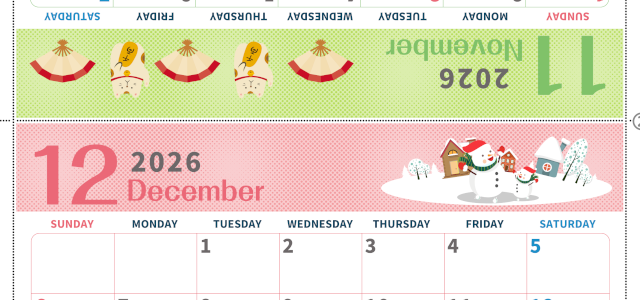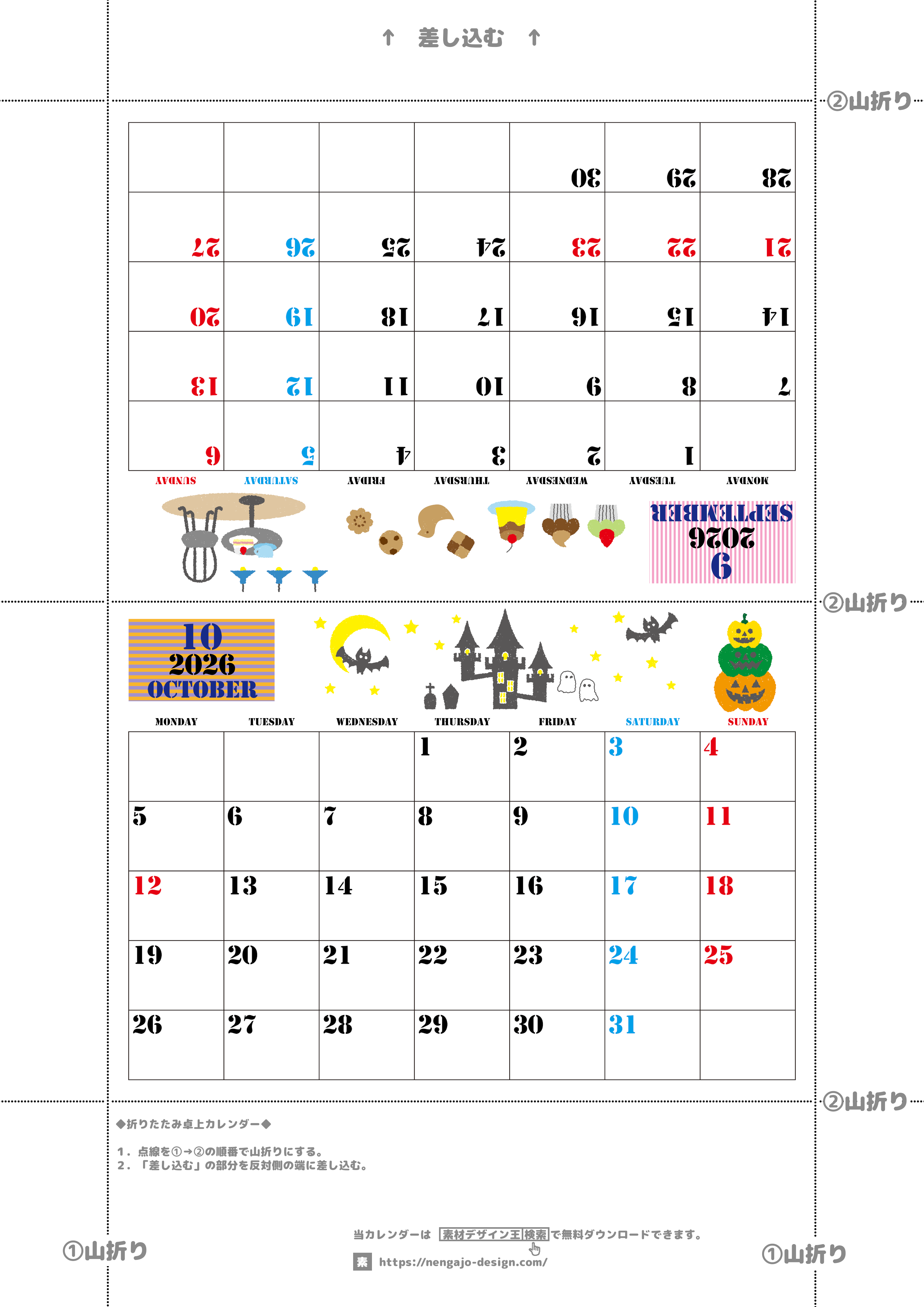 2026年の卓上カレンダー(9月・10月)は月曜始まり♪おしゃれなイラスト付き♪折り方が分かりやすいガイド付:無料(2026-000309-1031)