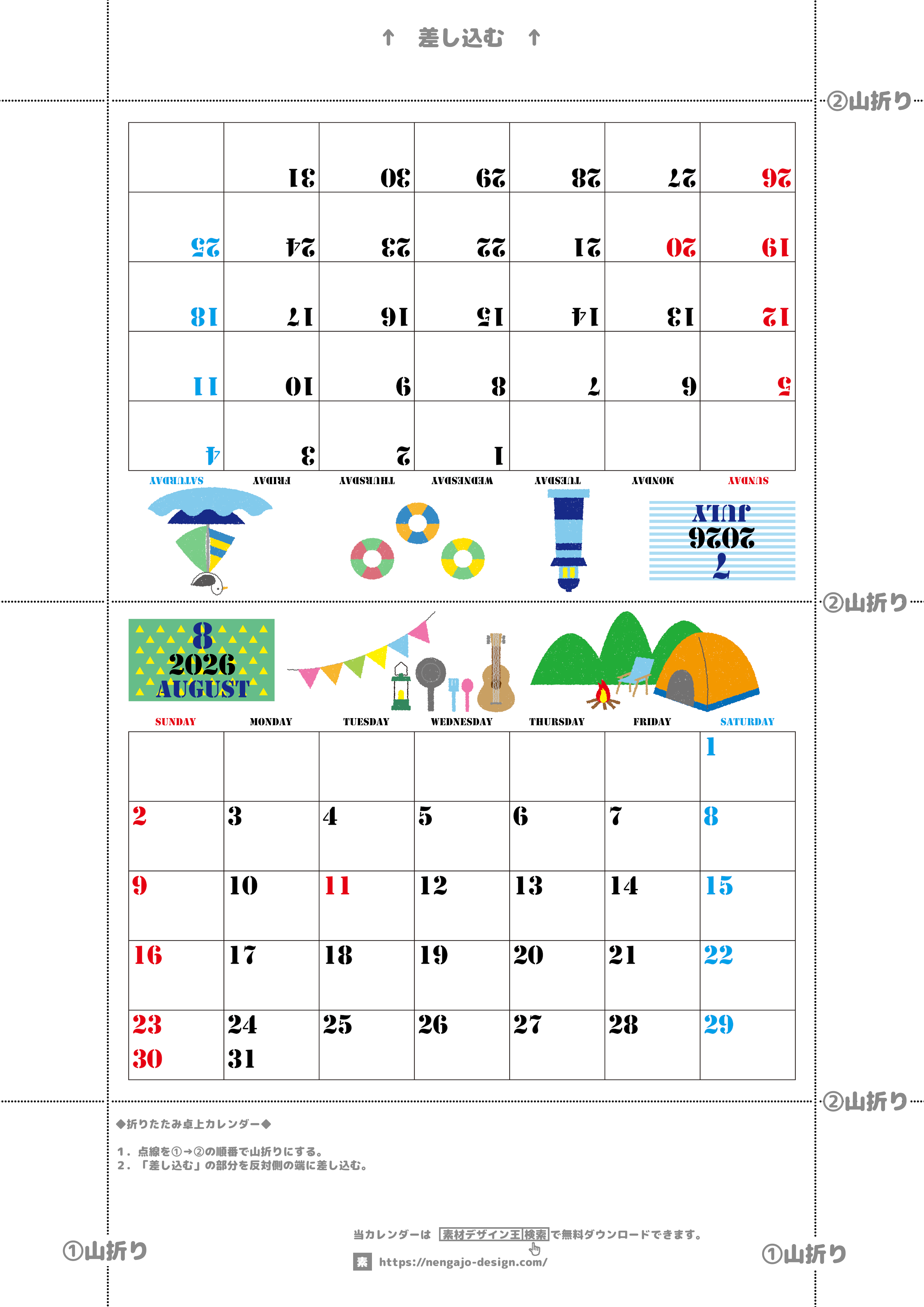 2026年・無料のカレンダーテンプレート 2026年の卓上カレンダー(7月・8月)は日曜始まり♪おしゃれなイラスト付き♪折り方が分かりやすいガイド付:無料(2026-000307-0830) 素材状デザイン王 2025年4月14日 2026年の卓上カレンダー(7月・8月)は日曜始まりです。おしゃれなイラスト付きなのでデスクに華やかさが添えられます。折り方が分かりやすいガイド付きでありながらもダウンロードは無料で行えます。(2026-000307-0830) おしゃれ カレンダーデザイン-0003 7月 8月 季節 日曜始まり 卓上