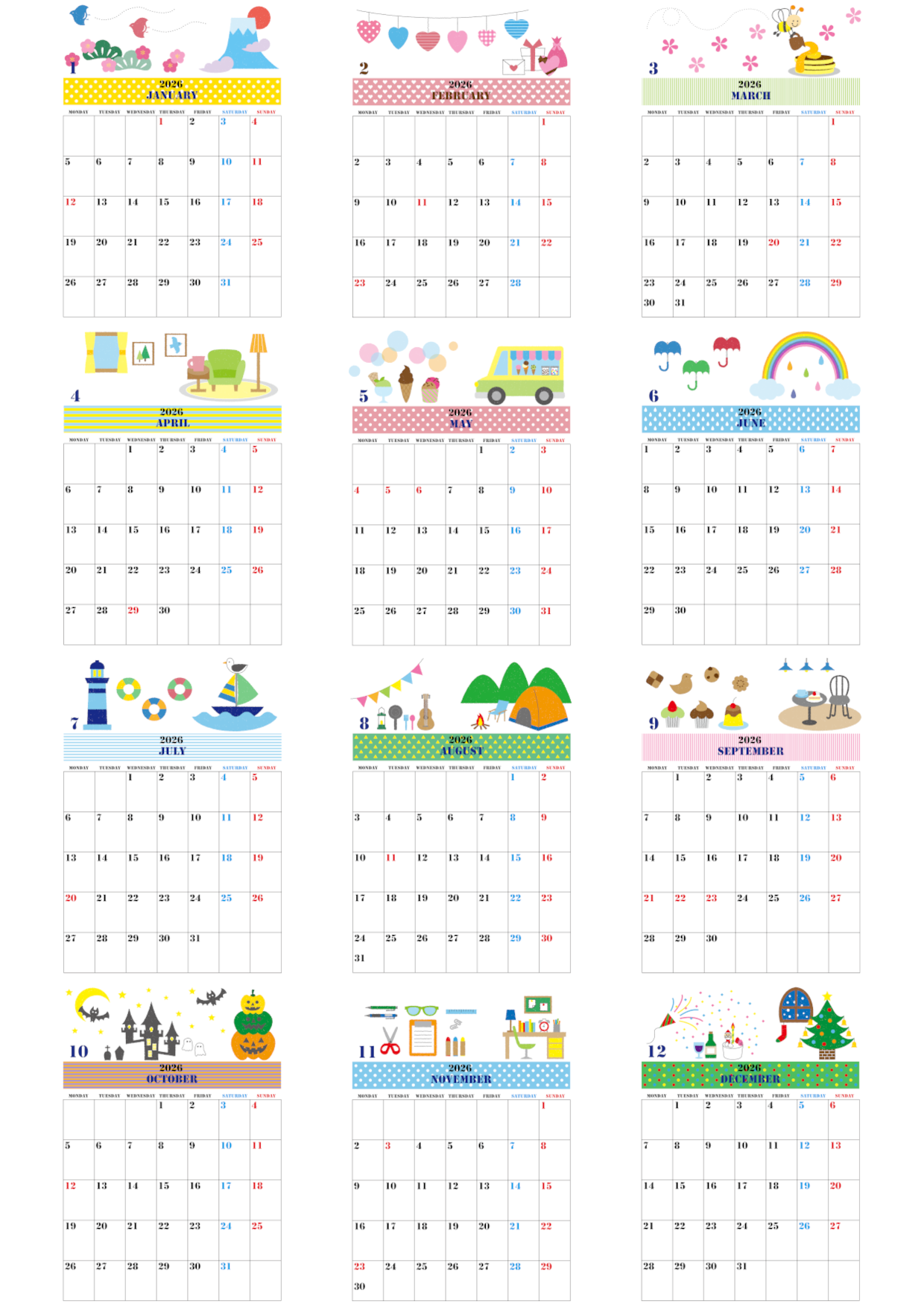 年間カレンダー2026を無料ダウンロードできます。A4縦型の月曜始まりで、学校や仕事のスケジュールと合わせて使いやすい形式です。おしゃれな配色とかわいいレイアウトで、毎日の予定確認が楽しくなる工夫がたっぷり詰まっています。書き込みスペースもしっかり確保されているため、イベント整理や長期計画にも活用できます。家庭用としてはもちろん、職場や学習スペースでも自然に馴染む上品さを備えた、実用性とデザイン性を両立した年間カレンダーです。