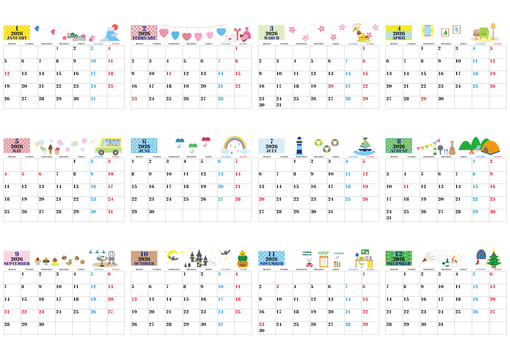 2026年間カレンダー♪A4横型の月曜始まりで明るい色合いが魅力!スケジュール管理が楽しくなる!無料ダウンロードできます!