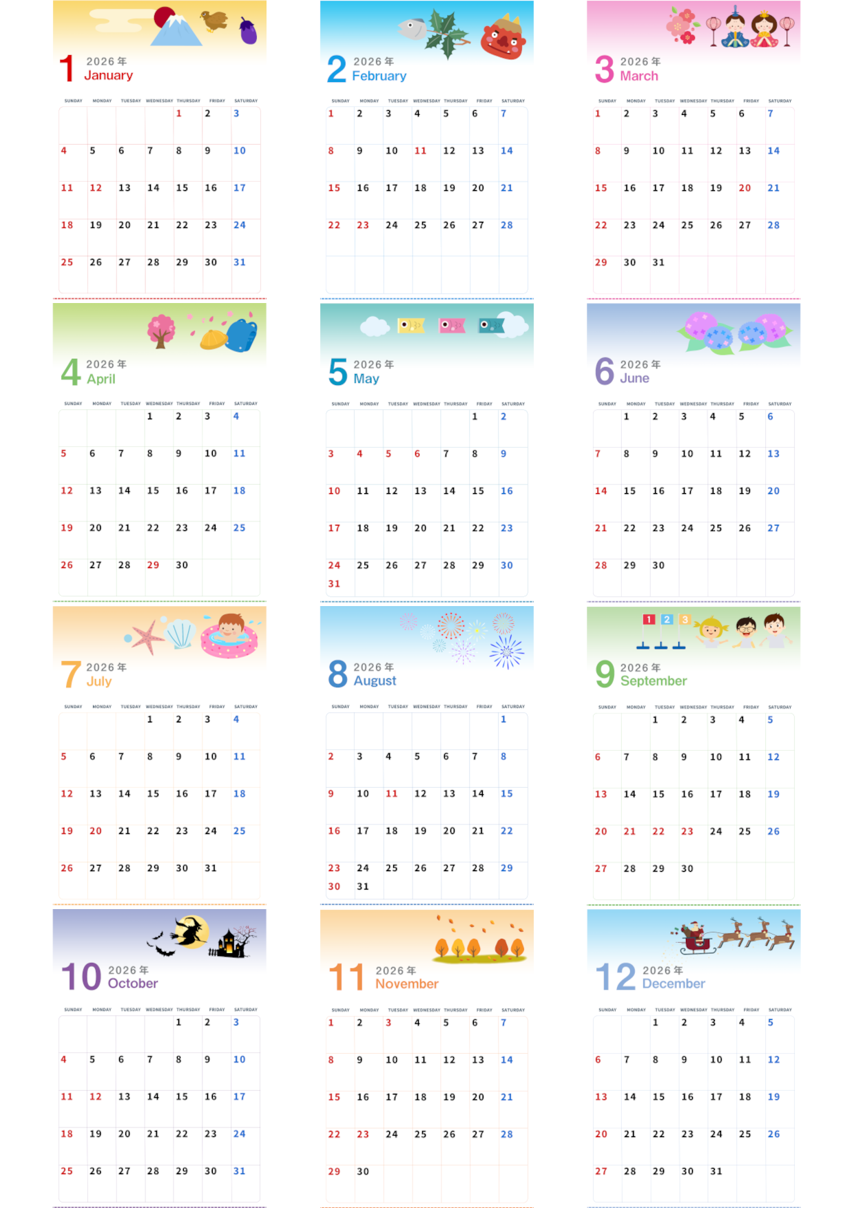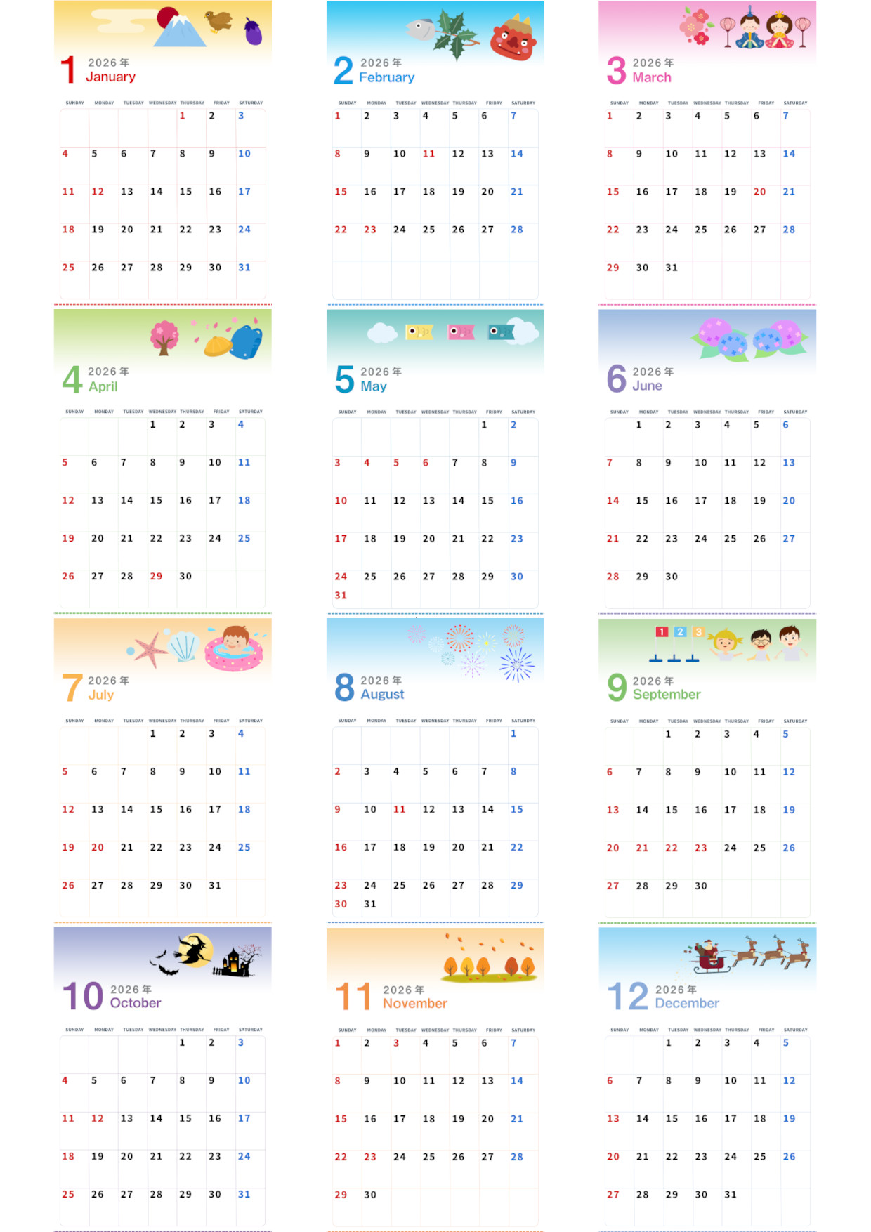 2026年間カレンダーを無料ダウンロードできます。A4縦型の日曜始まりで、家族みんなで使いやすいかわいいデザインです。やわらかい色合いと親しみやすいイラストで、年間の予定確認が楽しくできるカレンダーです。家庭の予定表として貼っておくと、スケジュールが共有しやすく便利です。学校行事や仕事の忙しい時期、旅行の計画などを整理しながら使える実用的なレイアウトです。