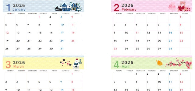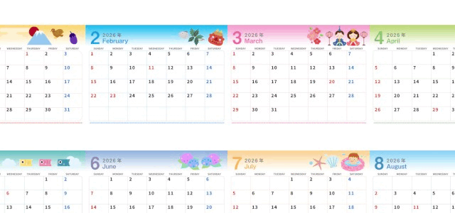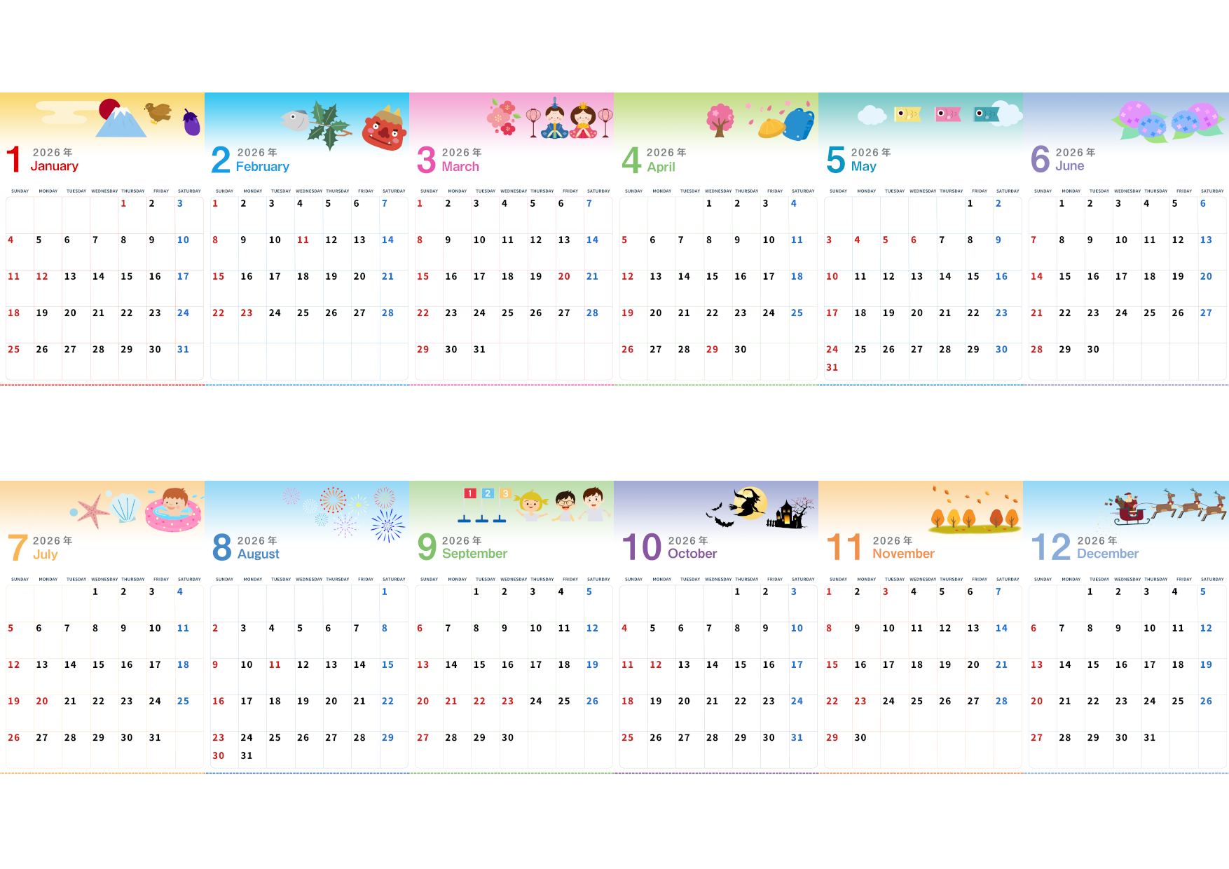 A4縦型で使える2026年の年間カレンダーを無料でダウンロードできます。日曜始まりで、予定の流れを直感的に把握しやすいシンプル構成です。年間の予定をまとめたいときに便利で、スペース確保に配慮された書き込みしやすいデザインが特徴です。優しい雰囲気の色合いで、リビングや学習スペースに貼るのにもおすすめです。家庭での予定共有やミニマルなスケジュール管理に使いやすいフリー素材です。