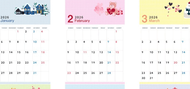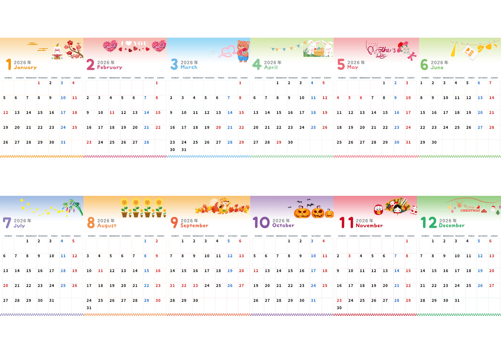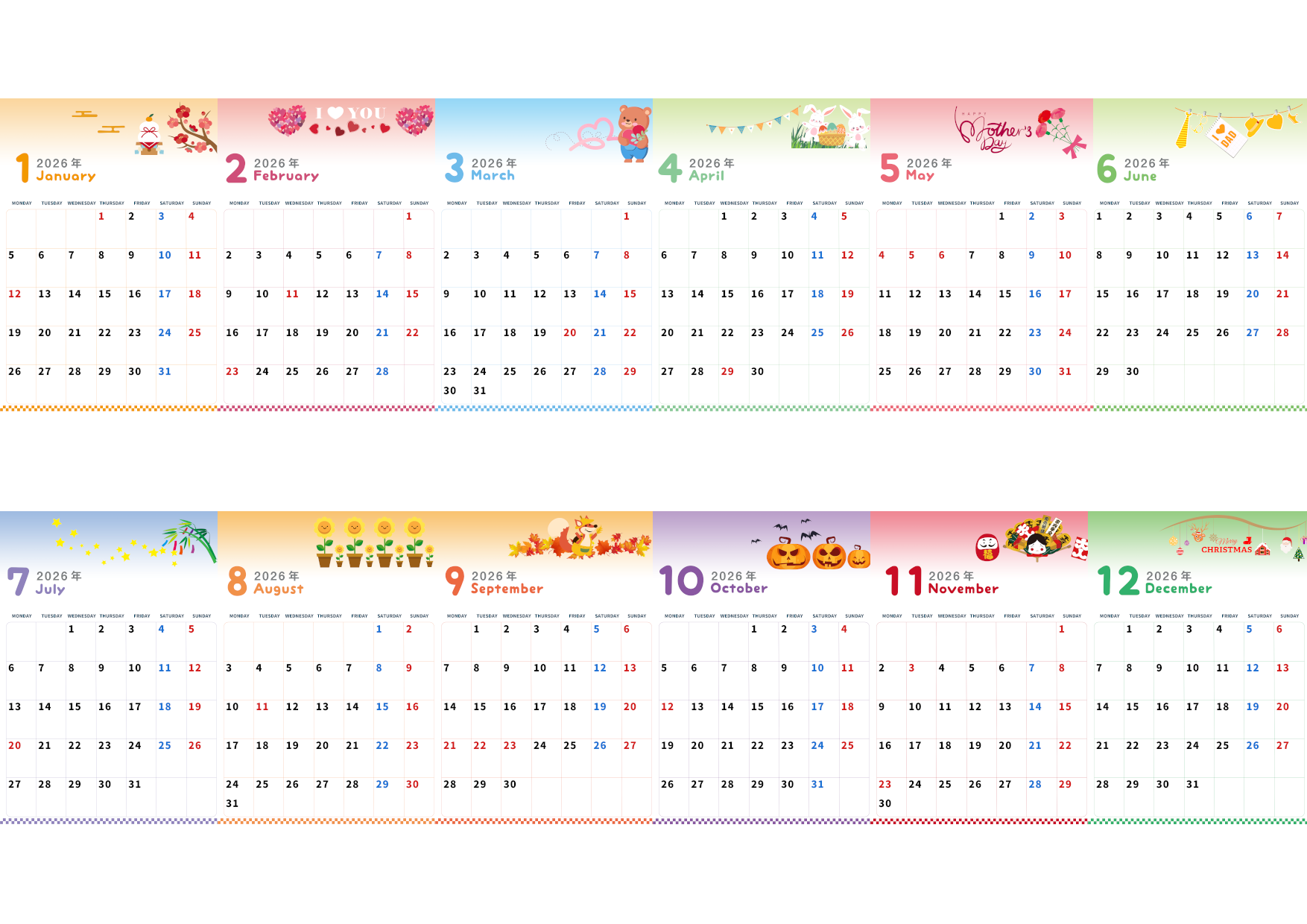 2026年版年間カレンダーを無料ダウンロードできます。A4縦型の月曜始まりで、かわいく使えるぷに文字デザインが特徴です。やさしい雰囲気で、家族の予定整理や学習管理にも活躍します。1枚で12ヶ月を一覧できるため、長期のスケジュールを俯瞰しながら計画できます。壁に貼ってもかわいい、実用とデザインのバランスが取れた年間カレンダーです。