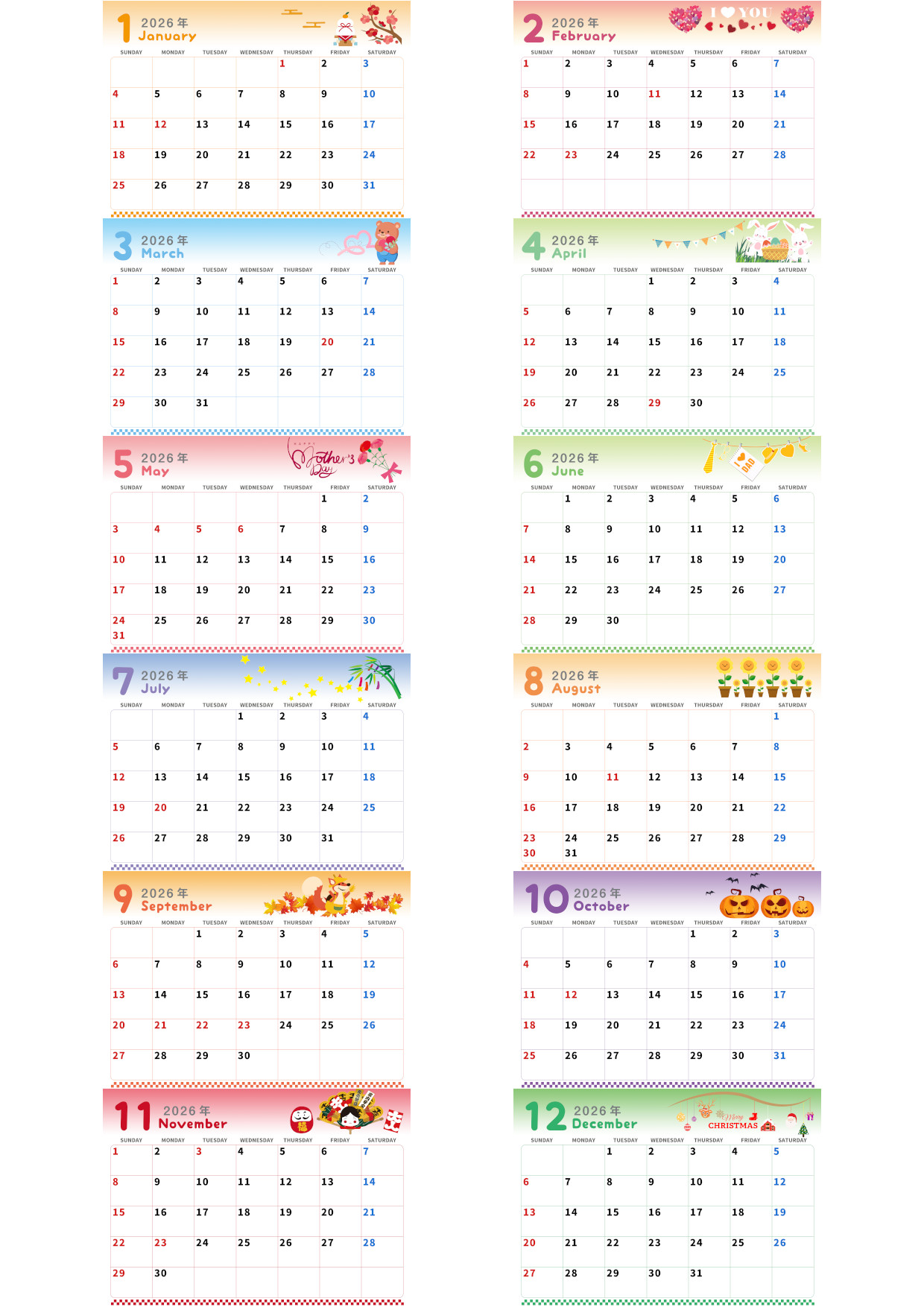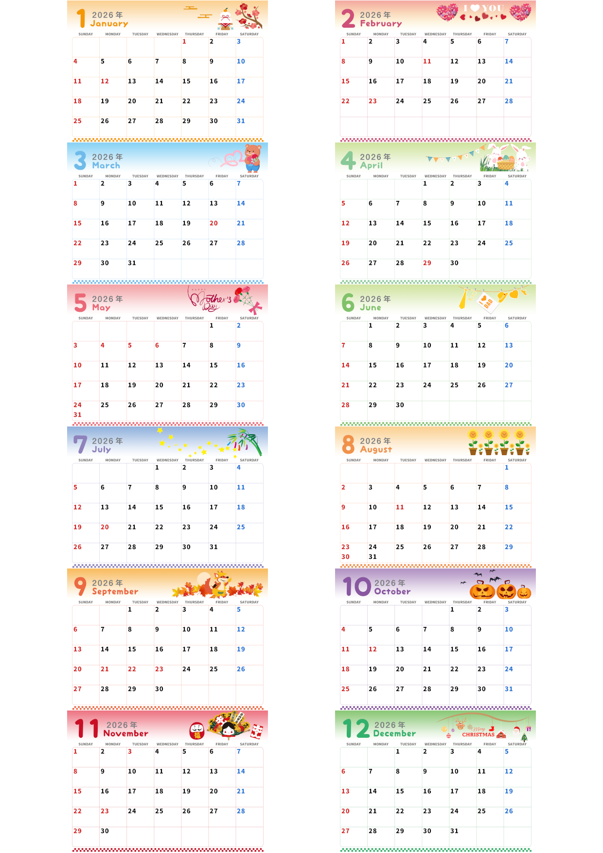2026年間カレンダーを無料ダウンロードできます。A4横型の日曜始まりで、ぷに文字がかわいいデザインです。見ているだけで癒される雰囲気で、毎日の予定を楽しく管理できます。親しみやすい丸みのある文字が特徴で、子ども部屋や学習スペースにもぴったりです。年間の予定を一覧できるため、イベントや行事の管理にも便利です。飾ってかわいい、使って便利な実用カレンダーです。