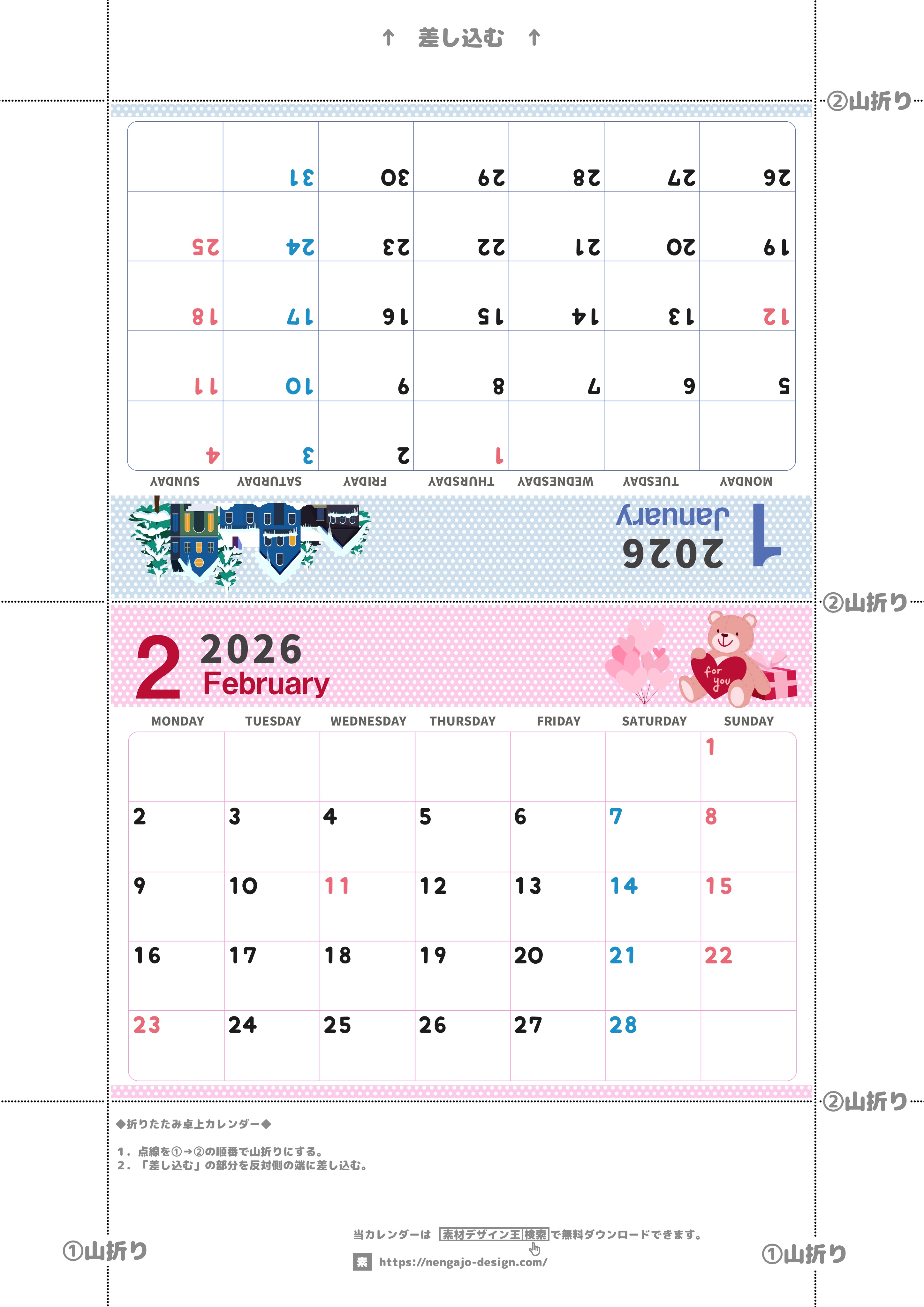 2026年・無料のカレンダーテンプレート 2026年の卓上カレンダー(1月・2月)は月曜始まり♪おしゃれなA4サイズでプリント可♪作り方が分かりやすい:無料(2026-000601-0231) 素材状デザイン王 2025年4月14日 2026年の卓上カレンダー(1月・2月)は月曜始まり♪おしゃれなA4サイズでプリント可♪作り方が分かりやすい:無料(2026-000601-0231) おしゃれ カレンダーデザイン-0006 1月 2月 季節 月曜始まり 卓上