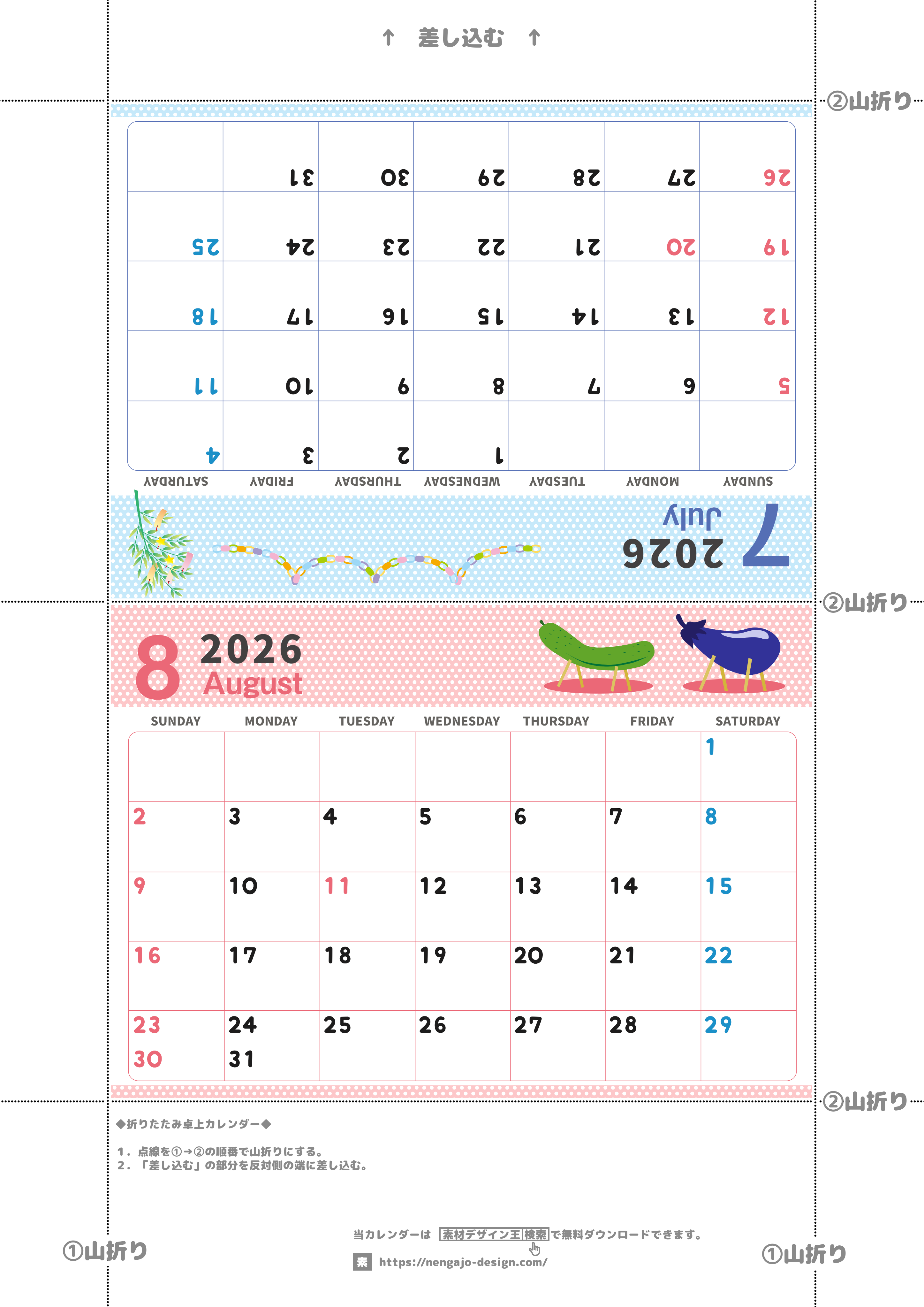 2026年の卓上カレンダー(7月・8月)は日曜始まり♪おしゃれなA4サイズでプリント可♪作り方が分かりやすい:無料(2026-000607-0830)