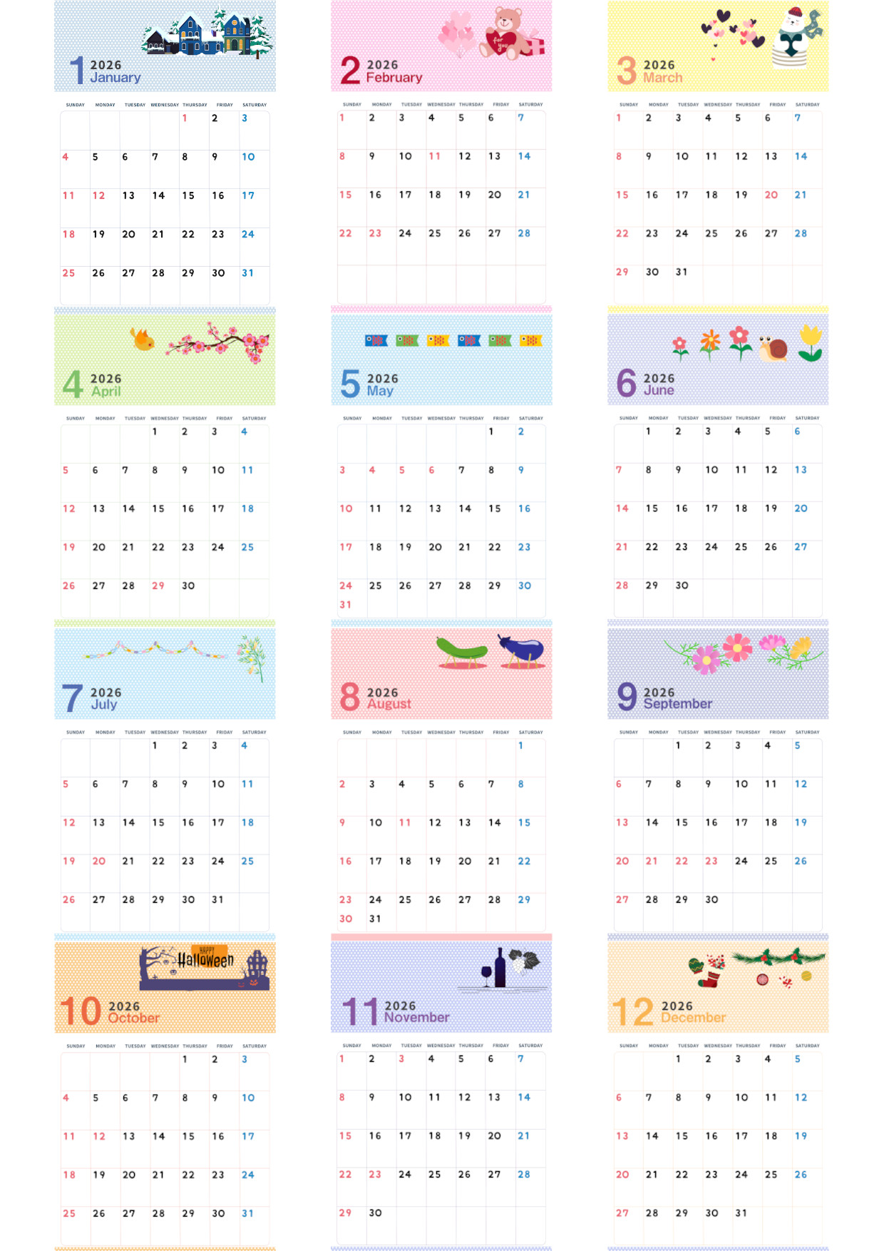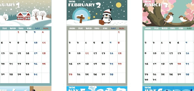 2026年間カレンダー♪A4縦型の日曜始まりで四季が楽しめるかわいいイラスト!使いやすい無料ダウンロード可能!