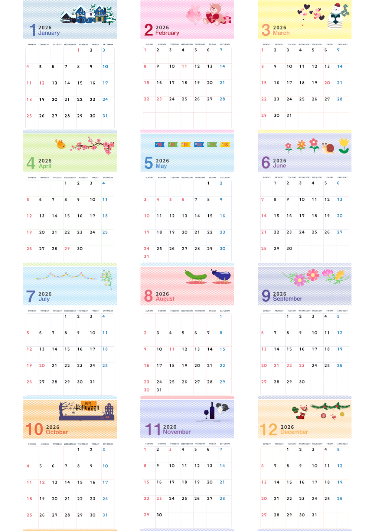 2026年間カレンダーを無料ダウンロードできます。A4縦型の日曜始まりで、四季が楽しめるかわいいイラストが特徴です。縦方向にすっきりまとまったレイアウトで、壁に貼っても圧迫感がなく見やすさが際立ちます。学校行事や家族の予定、習い事の整理など、一年の流れを俯瞰したいときに最適です。楽しく予定を管理したい方におすすめのフリー素材です。