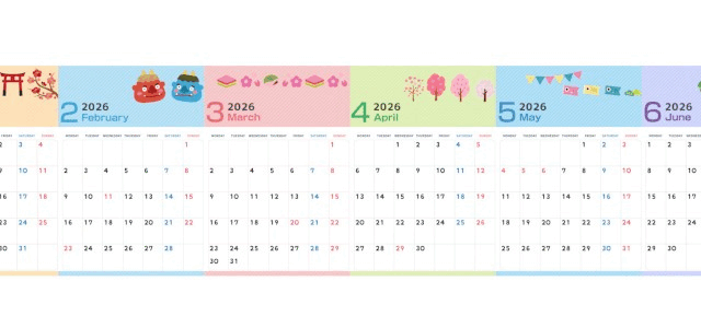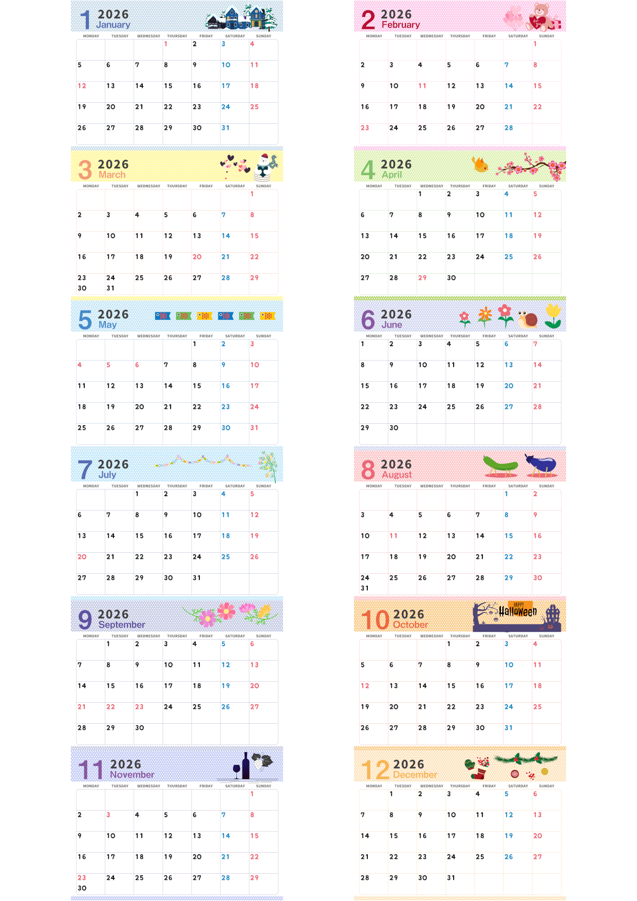2026年の年間カレンダーを無料ダウンロードできます。A4横型の月曜始まりで、かわいい季節イラストが各月に並ぶシンプルなデザインです。数字や曜日が見やすく整理されており、実用性の高さが魅力です。長期的なスケジュール管理や年間の予定を一目で把握したい時にぴったりです。家庭用の予定共有や仕事の長期プロジェクト管理にも活躍する、扱いやすいフリー素材です。