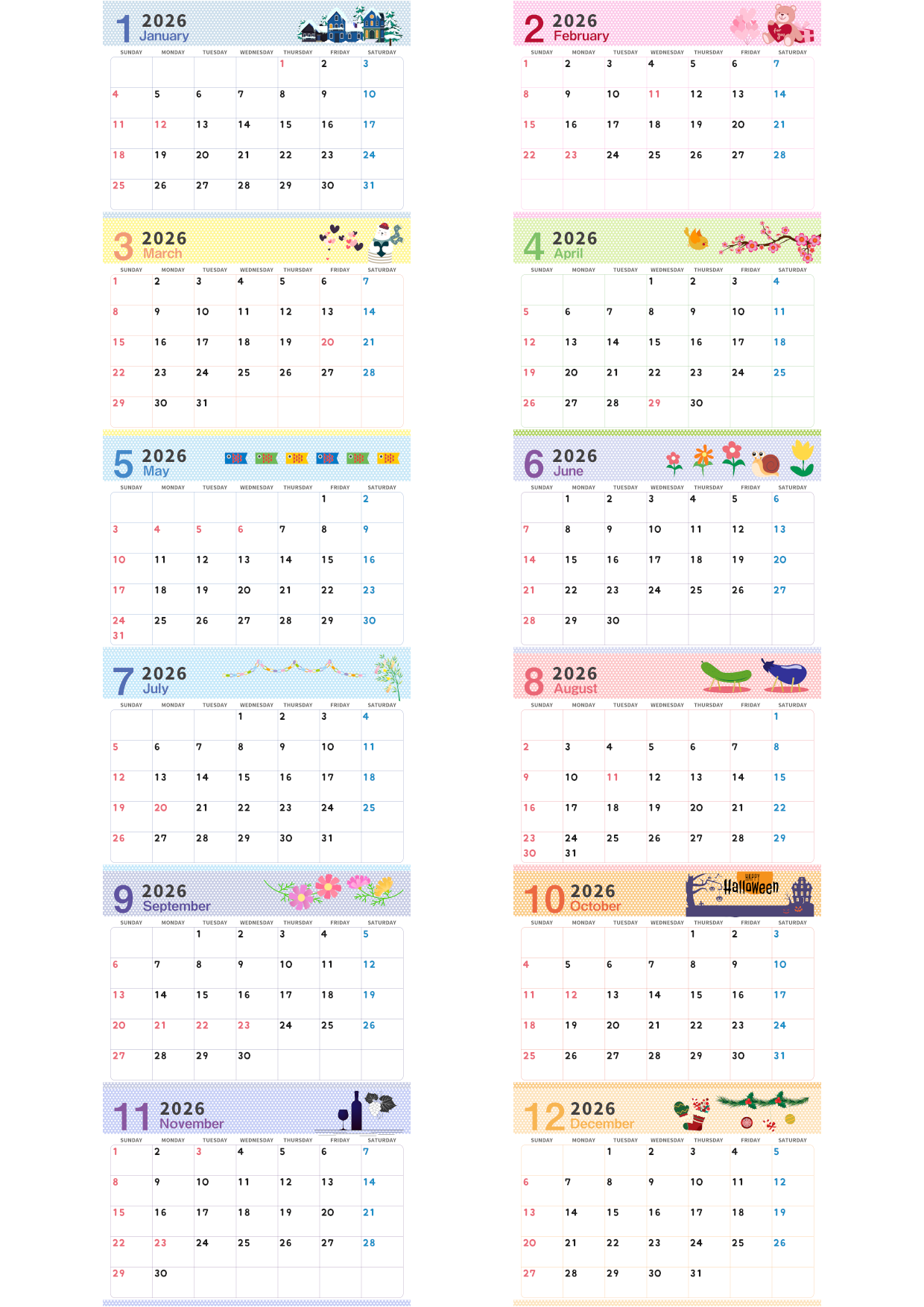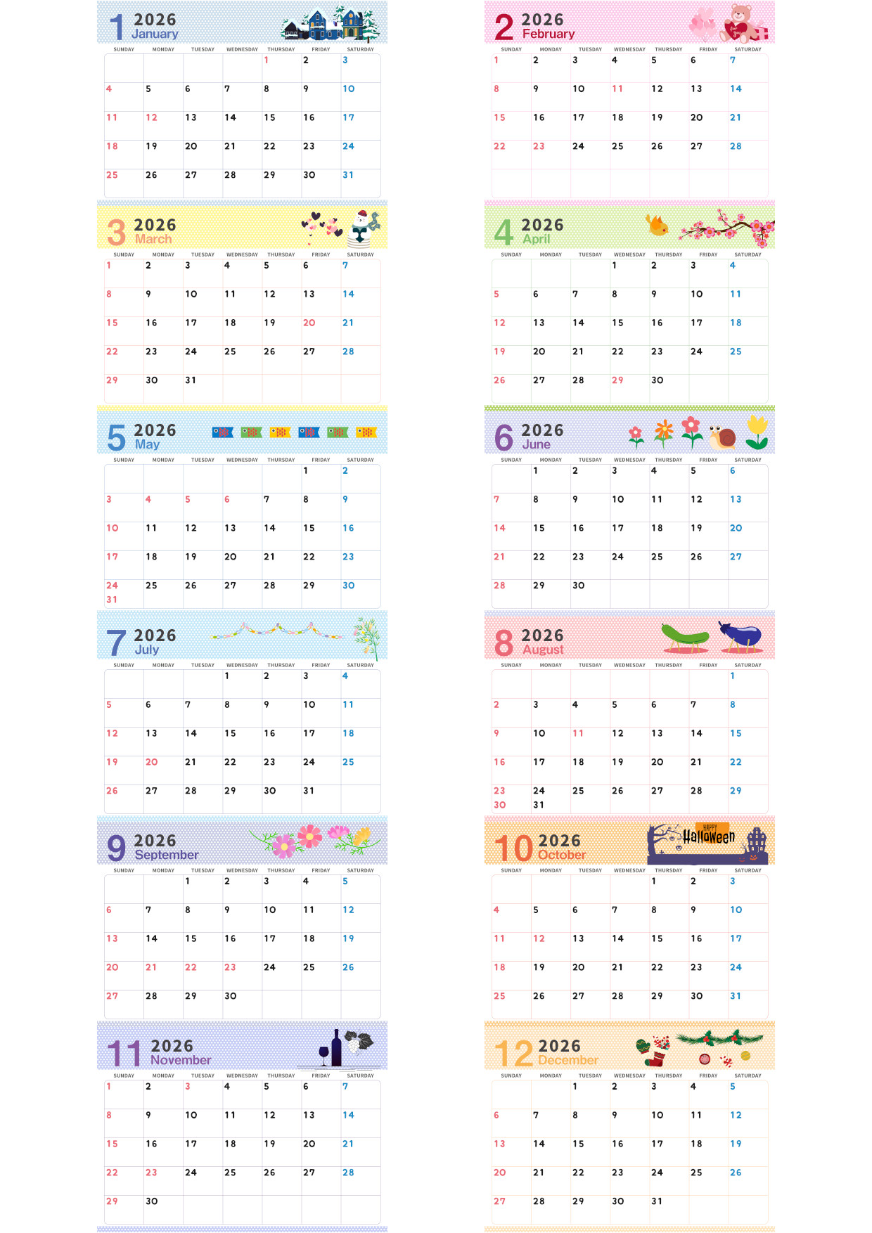 2026年版の年間カレンダーを無料ダウンロードできます。A4横型の日曜始まりで、四季を感じるかわいいイラストが紙面全体を彩ります。春の花や夏の海、秋の紅葉、冬の雪など、一年の移り変わりを視覚的に楽しみながら予定の管理ができます。シンプルで見やすく、家庭の予定表や学習計画、仕事の年間目標の整理にも最適です。1枚で12ヶ月を一覧できる便利なレイアウトで、実用性とかわいさの両方を重視した年間カレンダーです。