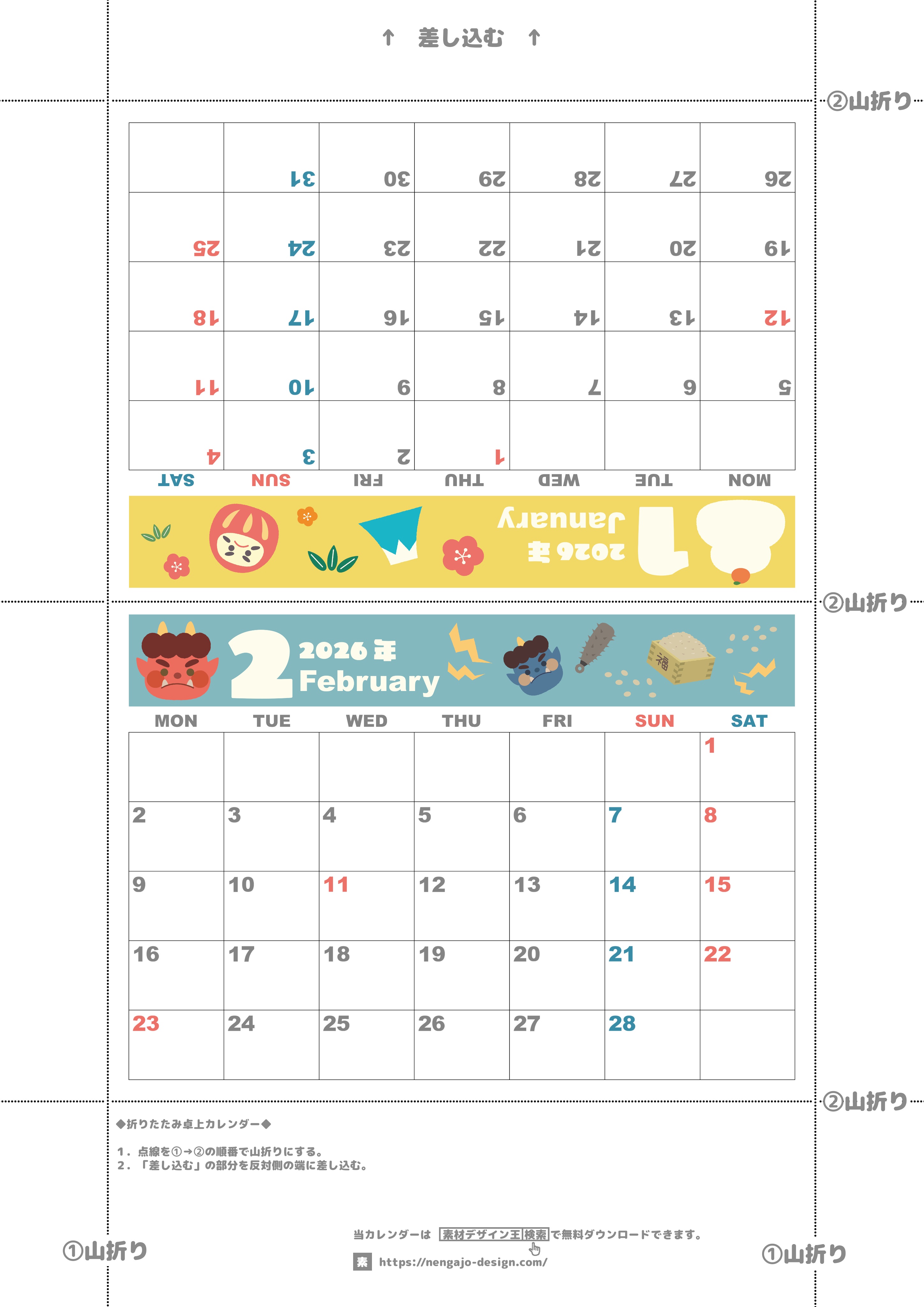 2026年・無料のカレンダーテンプレート 2026年の卓上カレンダー(1月・2月)は月曜始まり♪ポップなイラスト付き♪折り方が分かりやすいガイド付き:無料(2026-000701-0231) 素材状デザイン王 2025年4月14日 2026年の卓上カレンダー(1月・2月)は月曜始まり♪ポップなイラスト付き♪折り方が分かりやすいガイド付き:無料(2026-000701-0231) ポップ かわいい カレンダーデザイン-0007 1月 2月 月曜始まり 卓上
