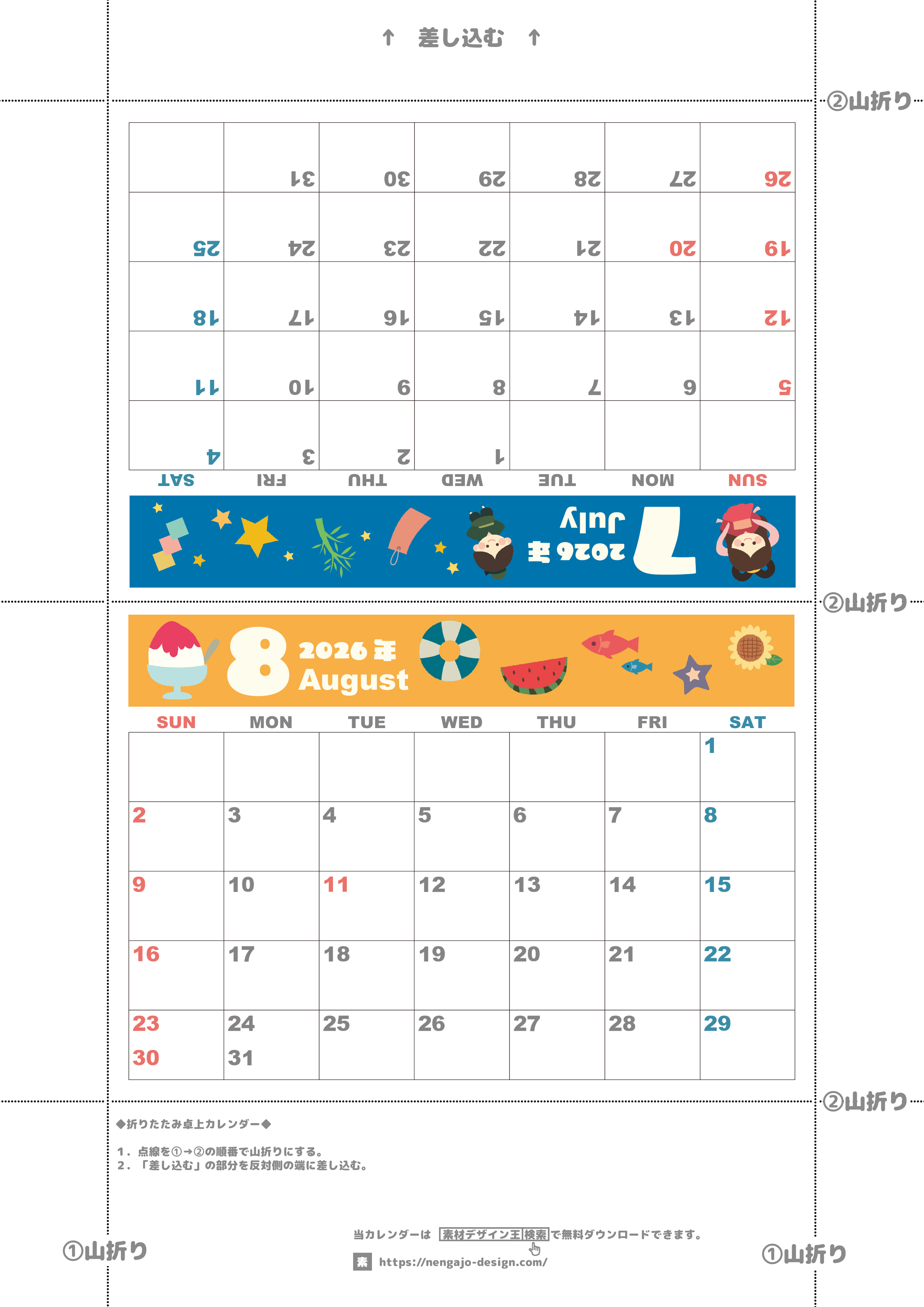 2026年の卓上カレンダー(7月・8月)は日曜始まり♪ポップなイラスト付き♪折り方が分かりやすいガイド付き:無料(2026-000707-0830)