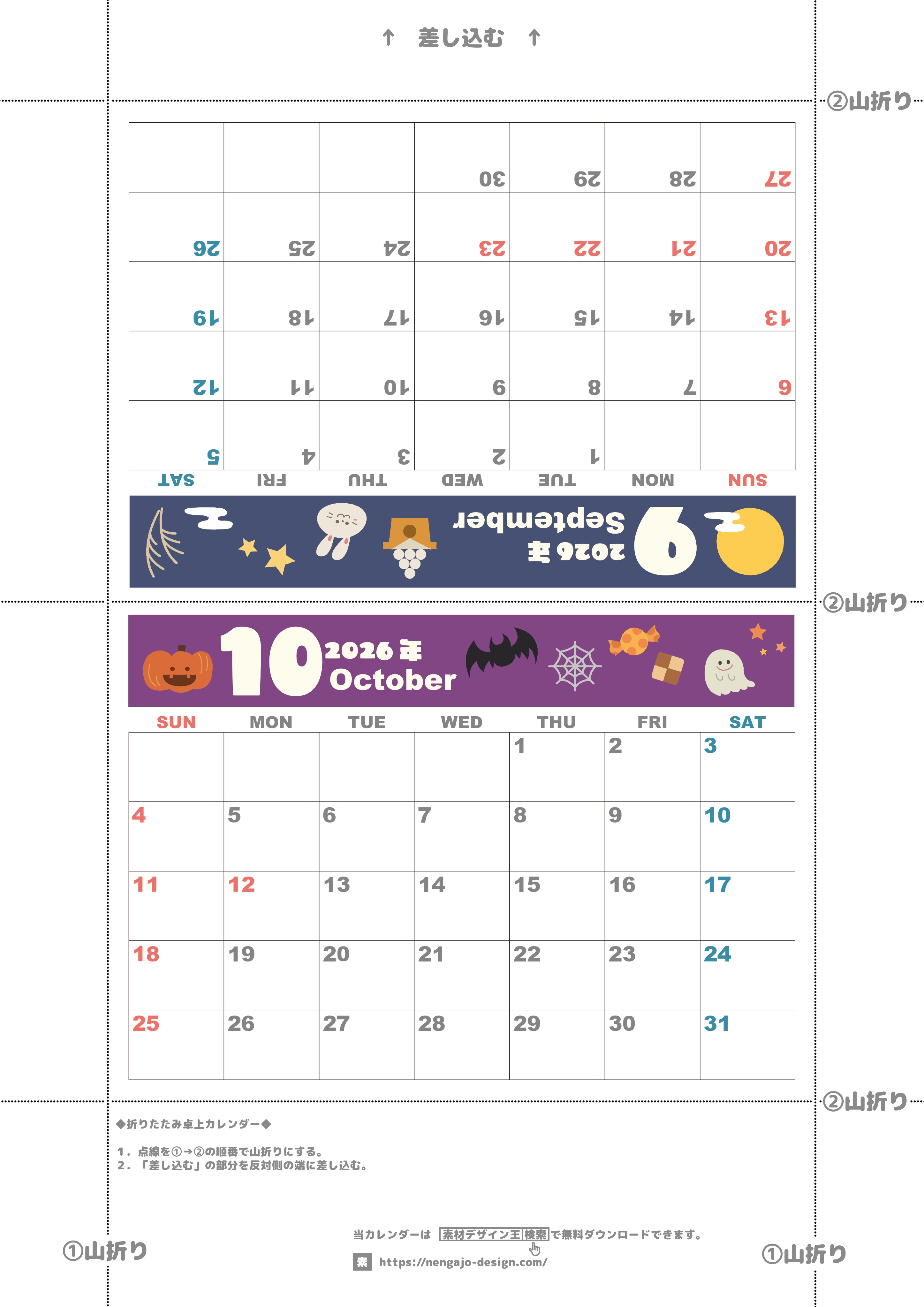 2026年の卓上カレンダー(9月・10月)は日曜始まり♪ポップなイラスト付き♪折り方が分かりやすいガイド付き:無料(2026-000709-1030)