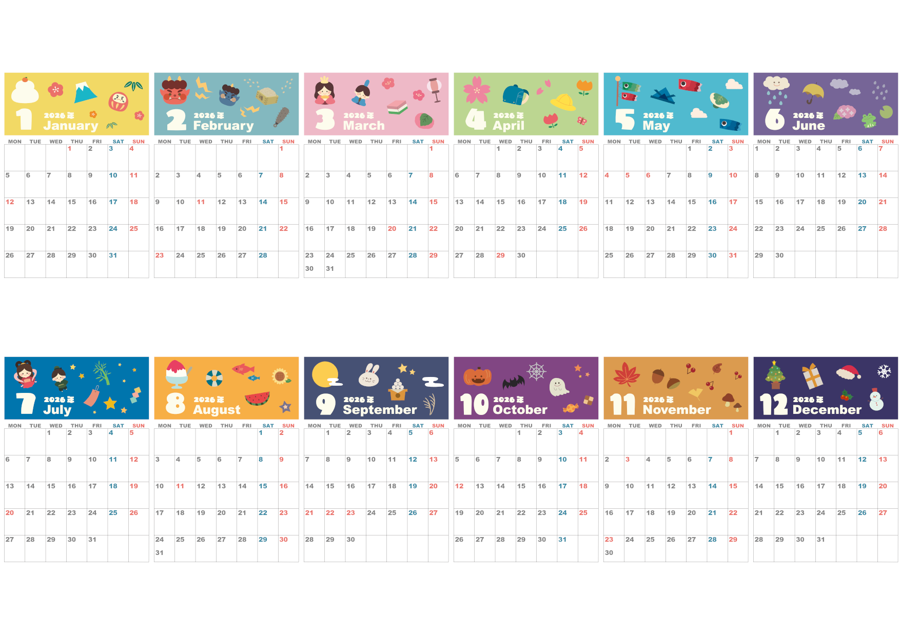 2026年版年間カレンダーを無料ダウンロードできます。A4縦型の月曜始まりで、かわいいポップイラストが楽しい雰囲気を演出します。見やすく整ったレイアウトで、長期の計画や家族の予定整理にも役立ちます。壁に貼ってもかわいい、実用とデザイン性を兼ね備えたカレンダーです。