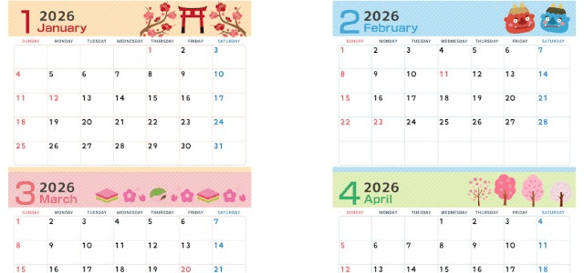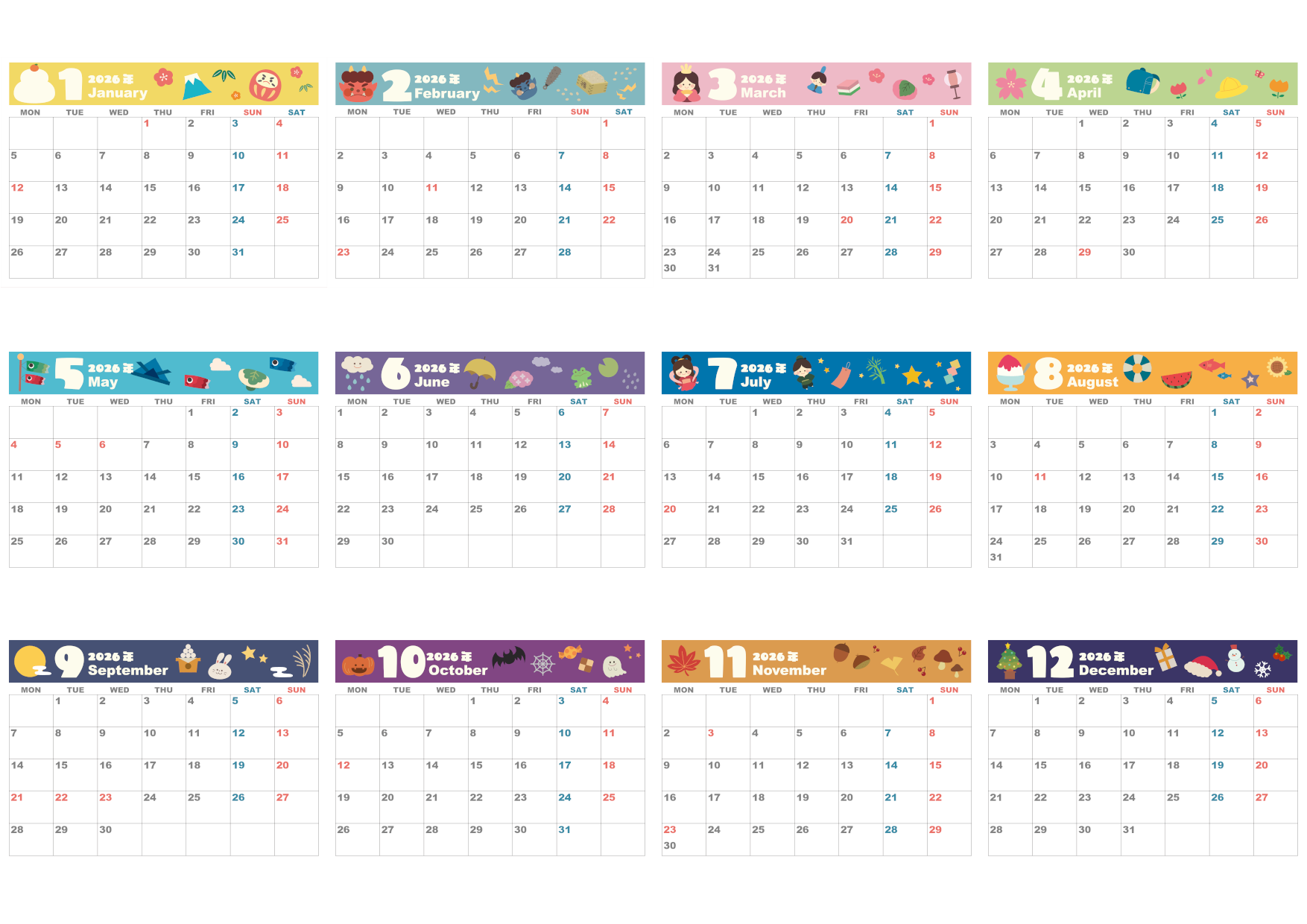 2026年間カレンダー♪A4横型の月曜始まりで遊び心ある楽しい雰囲気!無料でダウンロードできます!