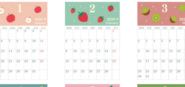 2026年間カレンダーを無料ダウンロードできます。A4横型の月曜始まりで、遊び心ある楽しい雰囲気のポップデザインです。数字や曜日の配置が整っており、見やすさと実用性を兼ね備えています。年間のイベント管理や勉強計画、仕事のスケジュール整理など幅広い用途に役立ちます。毎日使うものだからこそ、かわいさと機能性を両立したい方におすすめです。