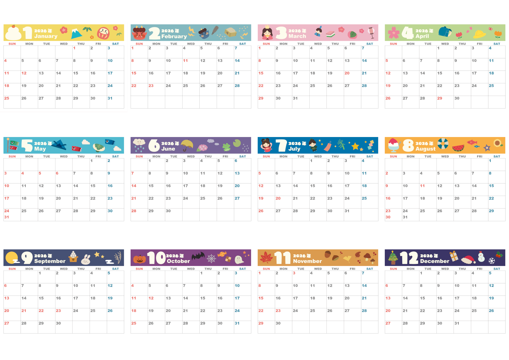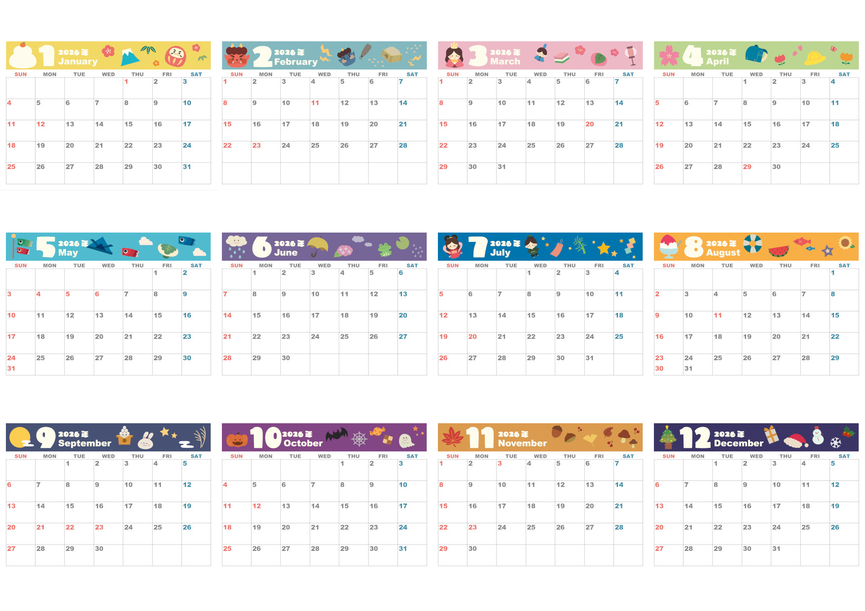 A4一枚で使える2026年の年間カレンダーを無料ダウンロードできます。横向きの日曜始まりで、楽しい気分になるカラフルなデザインが特徴です。12ヶ月をまとめて一覧できるレイアウトは、年間のイベントや旅行、受験スケジュールの管理に役立ちます。飾ってもかわいい雰囲気で、お部屋を明るく演出します。実用性と遊び心を兼ね備えたカレンダーです。