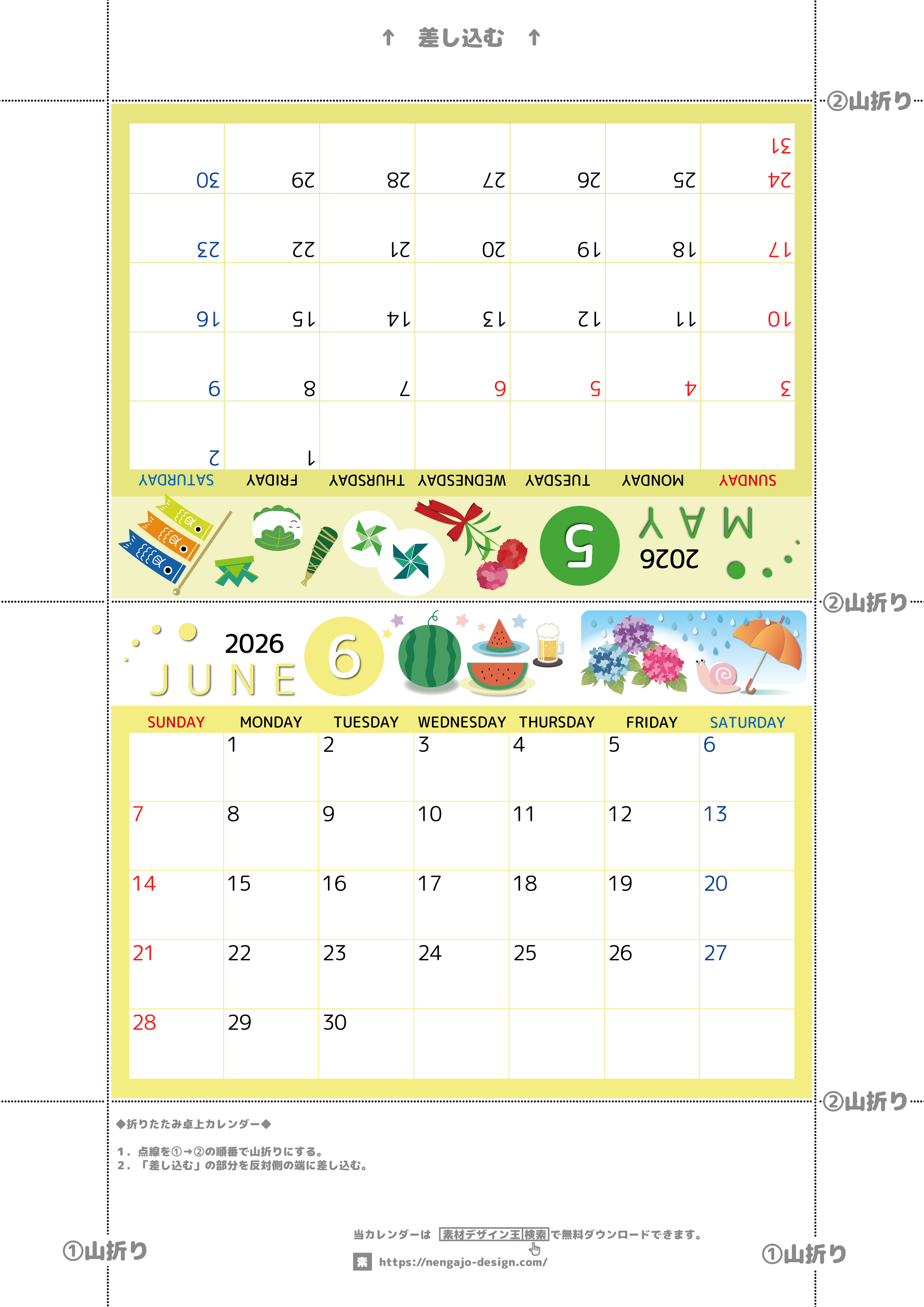 2026年の卓上カレンダー(5月・6月)は日曜始まり♪おしゃれなだけでなく折り方ガイド付きで作り方が簡単♪無料/A4(2026-000805-0630)