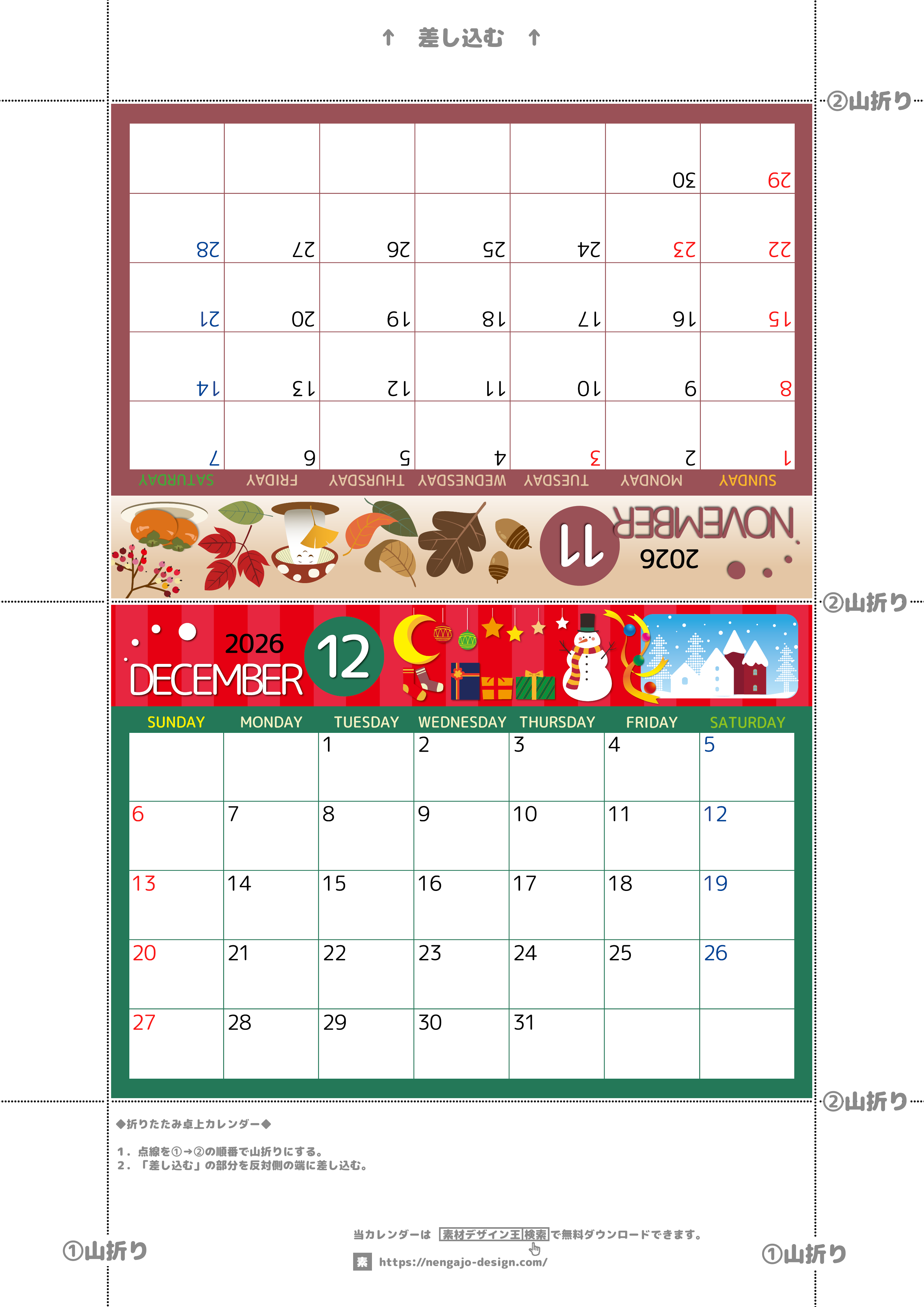 2026年・無料のカレンダーテンプレート 2026年の卓上カレンダー(11月・12月)は日曜始まり♪おしゃれなだけでなく折り方ガイド付きで作り方が簡単♪無料/A4(2026-000811-1230) 素材状デザイン王 2025年4月14日 2026年の卓上カレンダー(11月・12月)は日曜始まりです。おしゃれなだけでなく折り方ガイド付きなので作り方が簡単です、ハサミもいらないです。無料ダウンロードしてA4用紙に印刷しましょう。(2026-000811-1230) おしゃれ カレンダーデザイン-0008 11月 12月 季節 日曜始まり 卓上