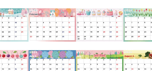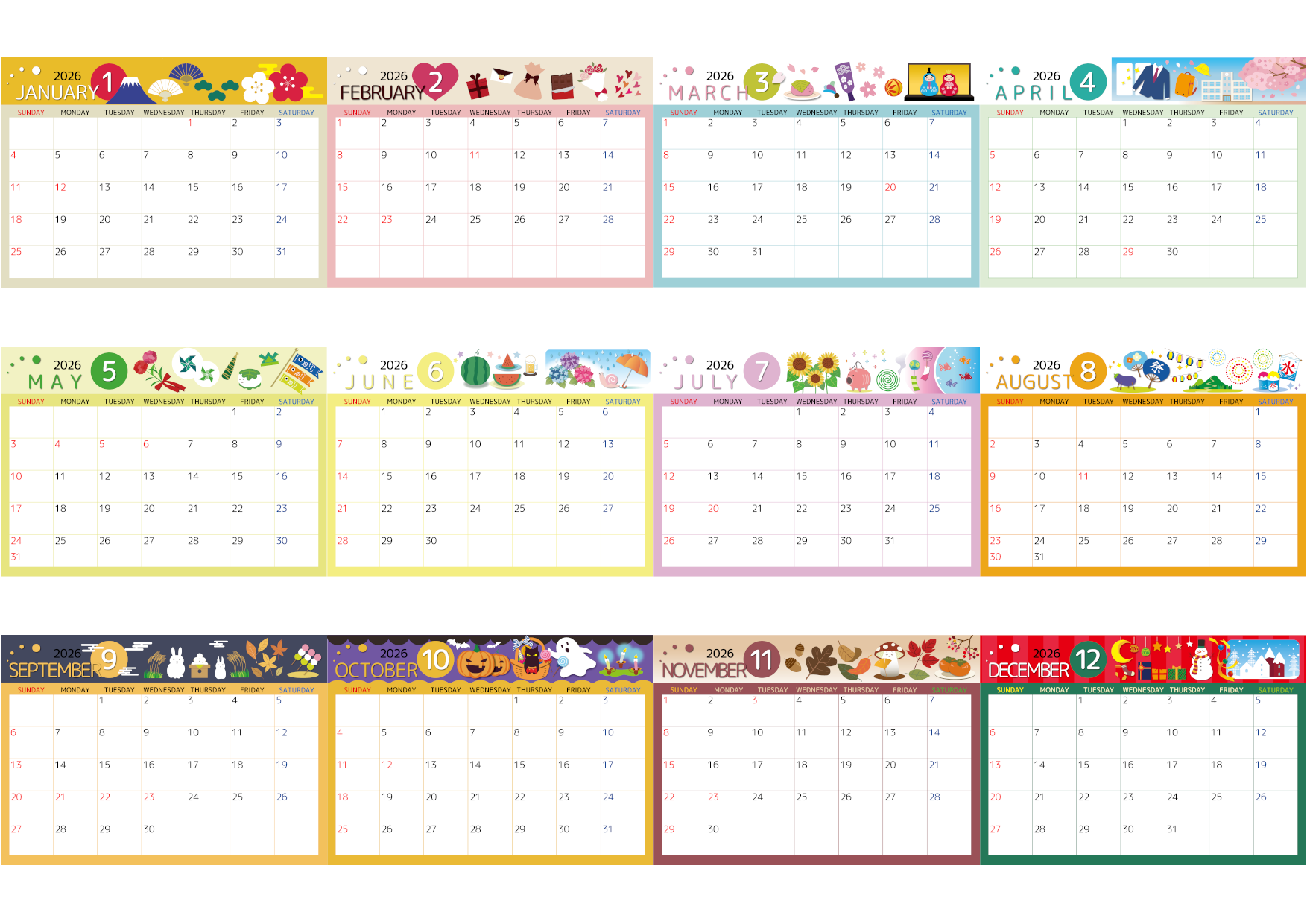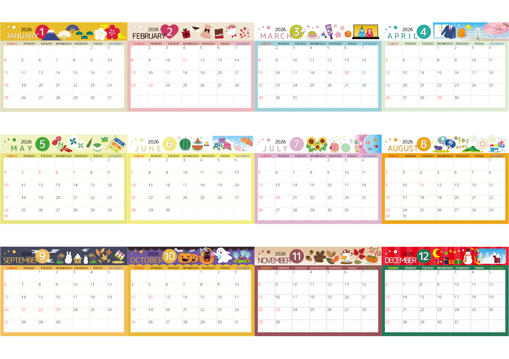 A4一枚で使える2026年の年間カレンダーを無料ダウンロードできます。横向きの日曜始まりで、落ち着いた雰囲気の実用デザインが魅力です。視認性が高く、長期間貼っても見やすさが続きます。家庭の予定管理や仕事の年間計画など、さまざまな用途に対応できます。シンプルで飽きのこないデザインを探している方に向いています。