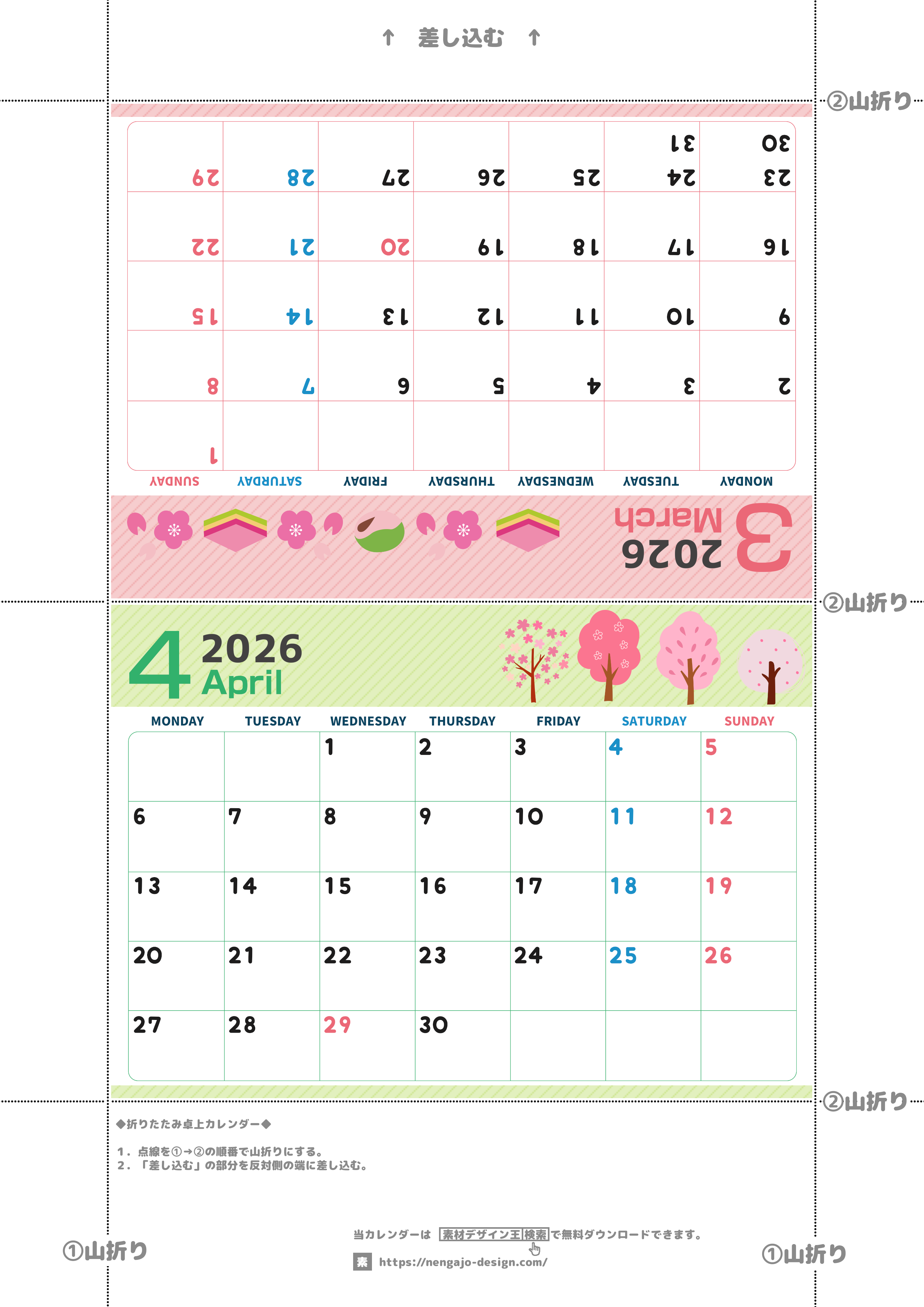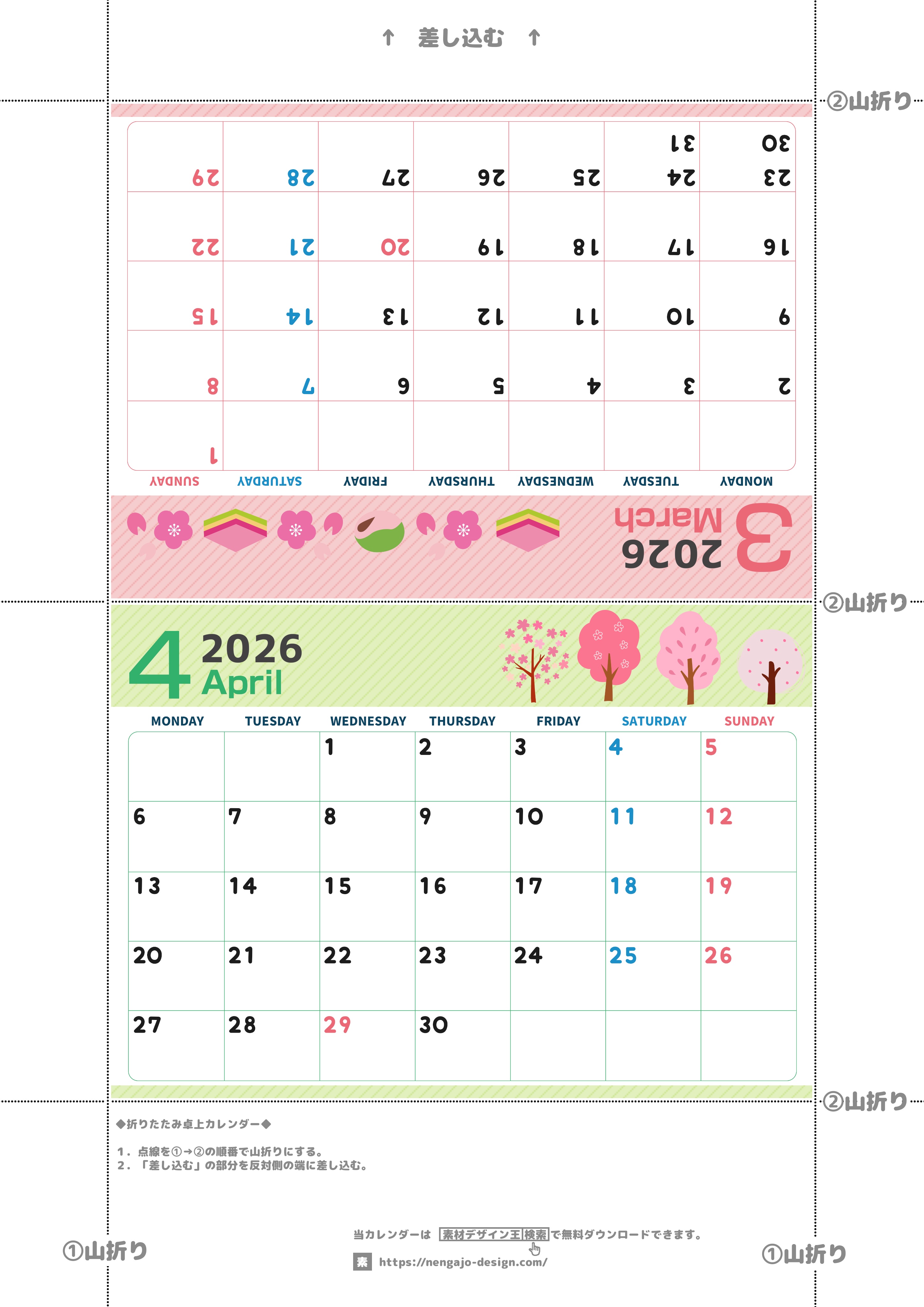 2026年・無料のカレンダーテンプレート 2026年の卓上カレンダー(3月・4月)は月曜始まり♪かわいいだけでなく折り方ガイド付なので作り方簡単:無料(2026-000903-0431) 素材状デザイン王 2025年4月14日 2026年の卓上カレンダー(3月・4月)は月曜始まり♪かわいいだけでなく折り方ガイド付なので作り方簡単:無料(2026-000903-0431) かわいい カレンダーデザイン-0009 3月 4月 家族 月曜始まり 卓上