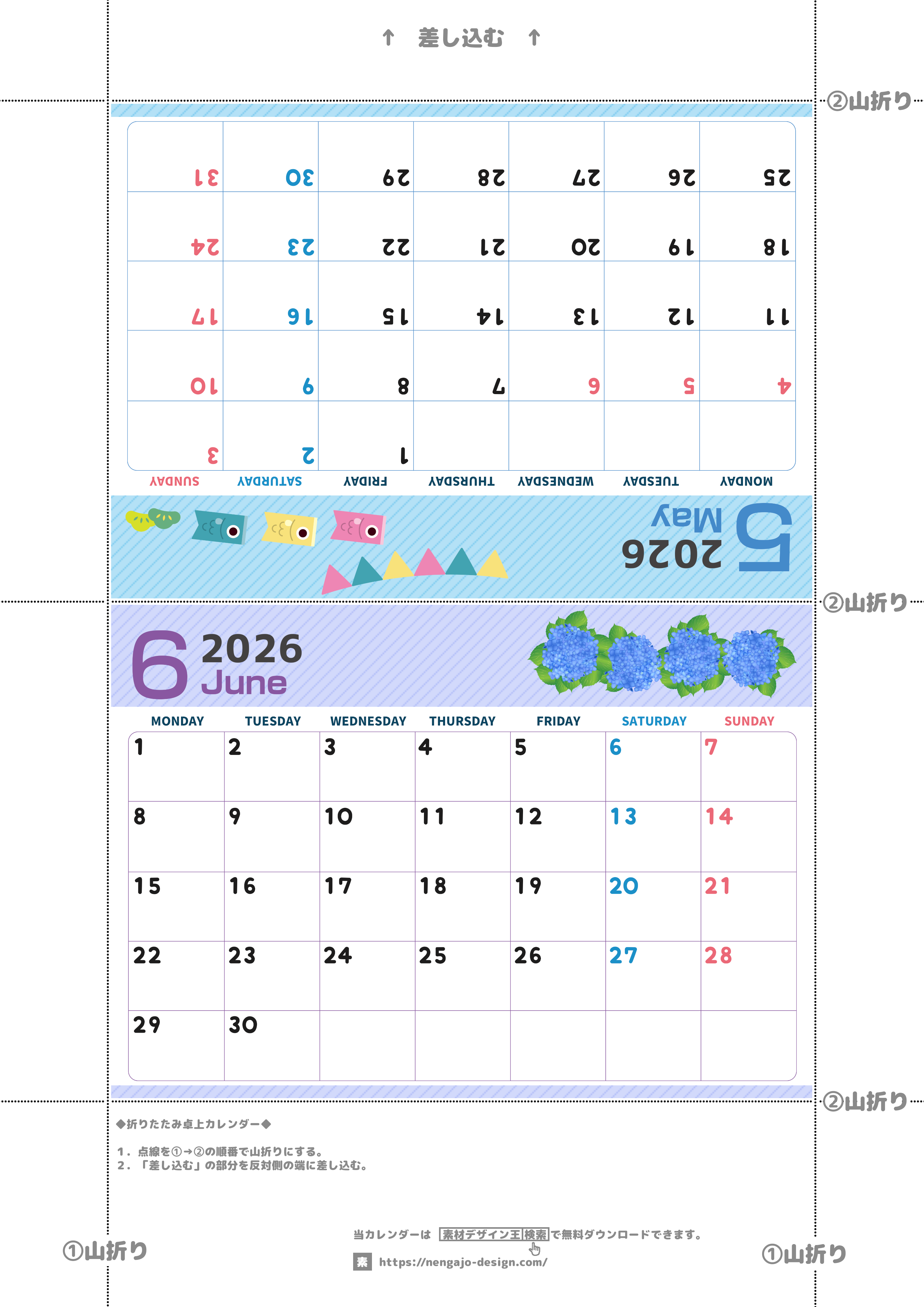 2026年・無料のカレンダーテンプレート 2026年の卓上カレンダー(5月・6月)は月曜始まり♪かわいいだけでなく折り方ガイド付なので作り方簡単:無料(2026-000905-0631) 素材状デザイン王 2025年4月14日 2026年の卓上カレンダー(5月・6月)は月曜始まり♪かわいいだけでなく折り方ガイド付なので作り方簡単:無料(2026-000905-0631) かわいい カレンダーデザイン-0009 5月 6月 家族 月曜始まり 卓上