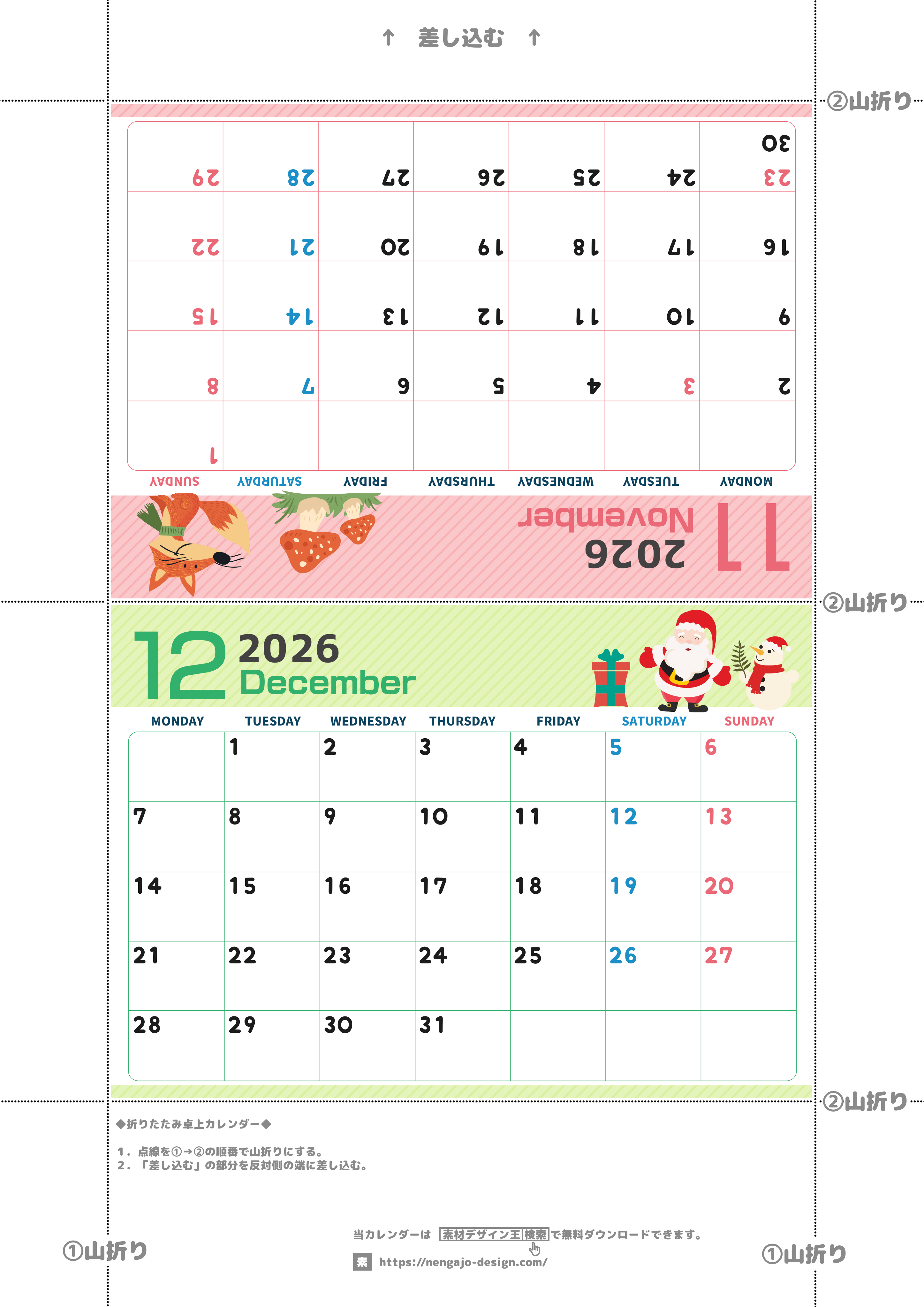 2026年の卓上カレンダー(11月・12月)は月曜始まり♪かわいいだけでなく折り方ガイド付なので作り方簡単:無料(2026-000911-1231)