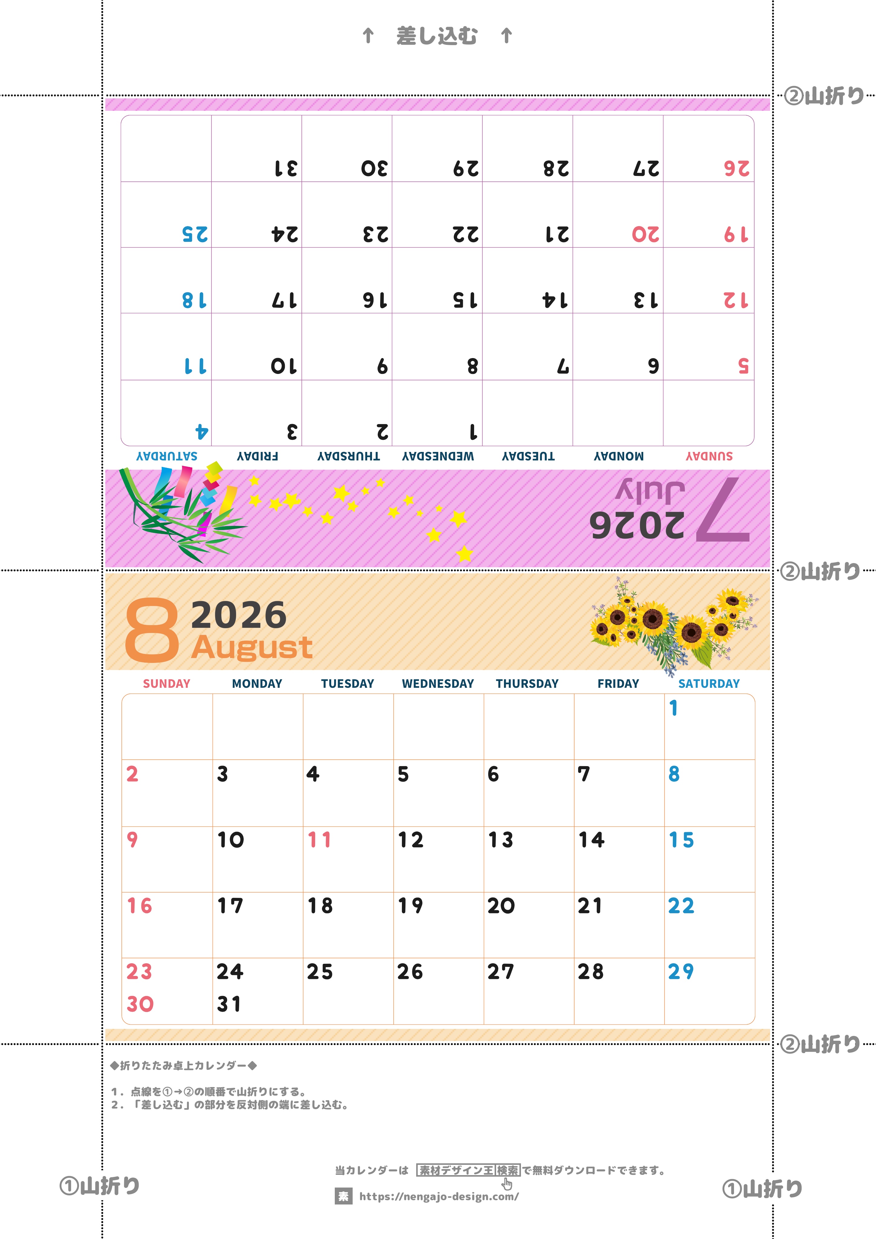 2026年・無料のカレンダーテンプレート 2026年の卓上カレンダー(7月・8月)は日曜始まり♪かわいいだけでなく折り方ガイド付なので作り方簡単:無料(2026-000907-0830) 素材状デザイン王 2025年4月14日 2026年の卓上カレンダー(7月・8月)は日曜始まりです。かわいいだけでなく折り方のガイドが付いているので作り方がとても簡単です。無料にてダウンロードが行えます。(2026-000907-0830) かわいい カレンダーデザイン-0009 7月 8月 家族 日曜始まり 卓上