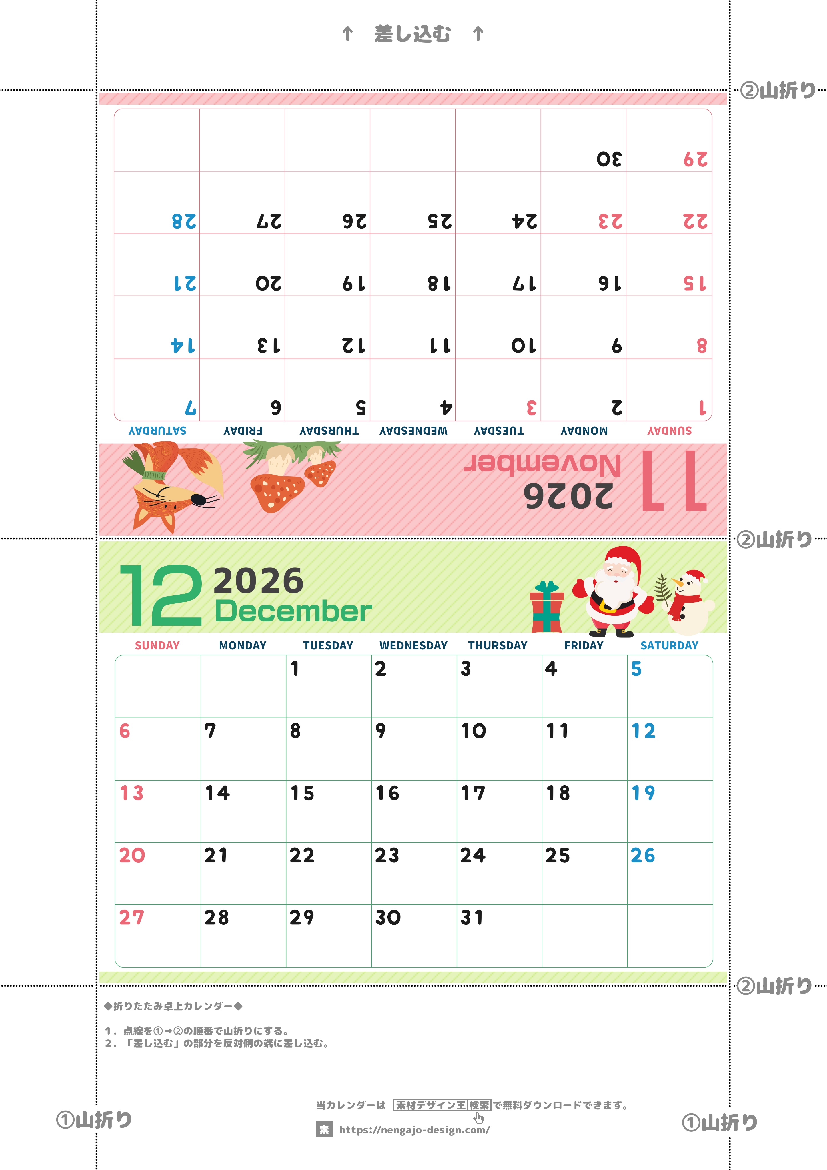 2026年・無料のカレンダーテンプレート 2026年の卓上カレンダー(11月・12月)は日曜始まり♪かわいいだけでなく折り方ガイド付なので作り方簡単:無料(2026-000911-1230) 素材状デザイン王 2025年4月14日 2026年の卓上カレンダー(11月・12月)は日曜始まりです。かわいいだけでなく折り方のガイドが付いているので作り方がとても簡単です。無料にてダウンロードが行えます。(2026-000911-1230) かわいい カレンダーデザイン-0009 11月 12月 家族 日曜始まり 卓上