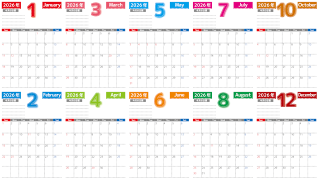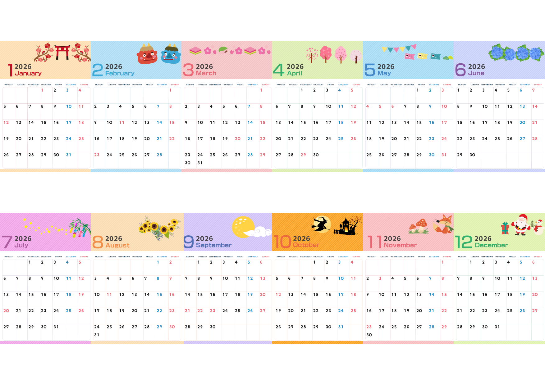 2026年版年間カレンダーを無料ダウンロードできます。A4縦型の月曜始まりで、家族で共有しやすい実用的なレイアウトが魅力です。予定管理やイベント整理がスムーズにでき、壁掛けにもデスク用にも使えます。毎日の生活に役立つ実用フリー素材です。