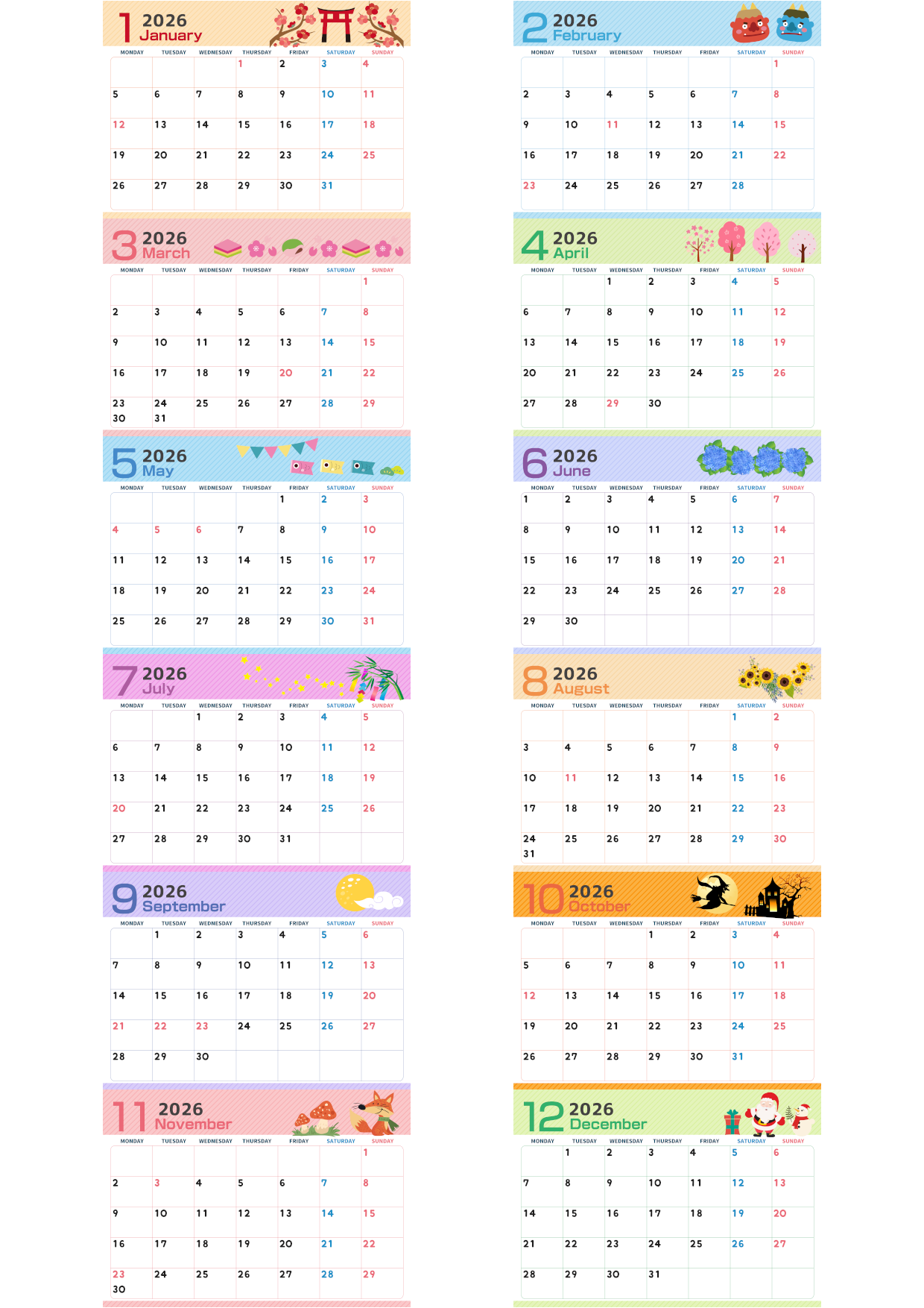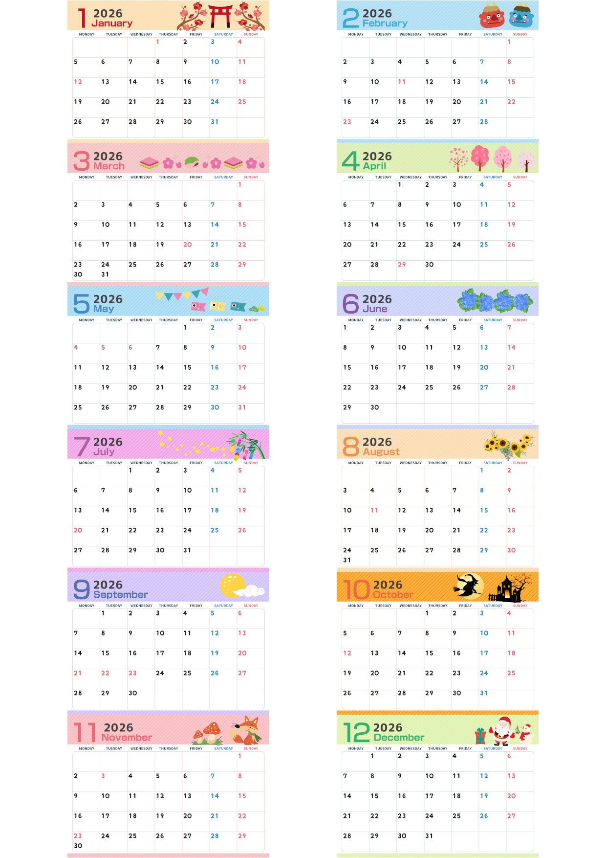 2026年の年間カレンダーを無料ダウンロードできます。A4横型の月曜始まりで、夫婦や家族で共有しやすい実用デザインです。1枚で年間の予定をまとめて確認でき、長期の計画調整やイベント管理に便利です。視認性の高いレイアウトで、どんな場所にも貼りやすく、毎日の予定が整理しやすくなります。